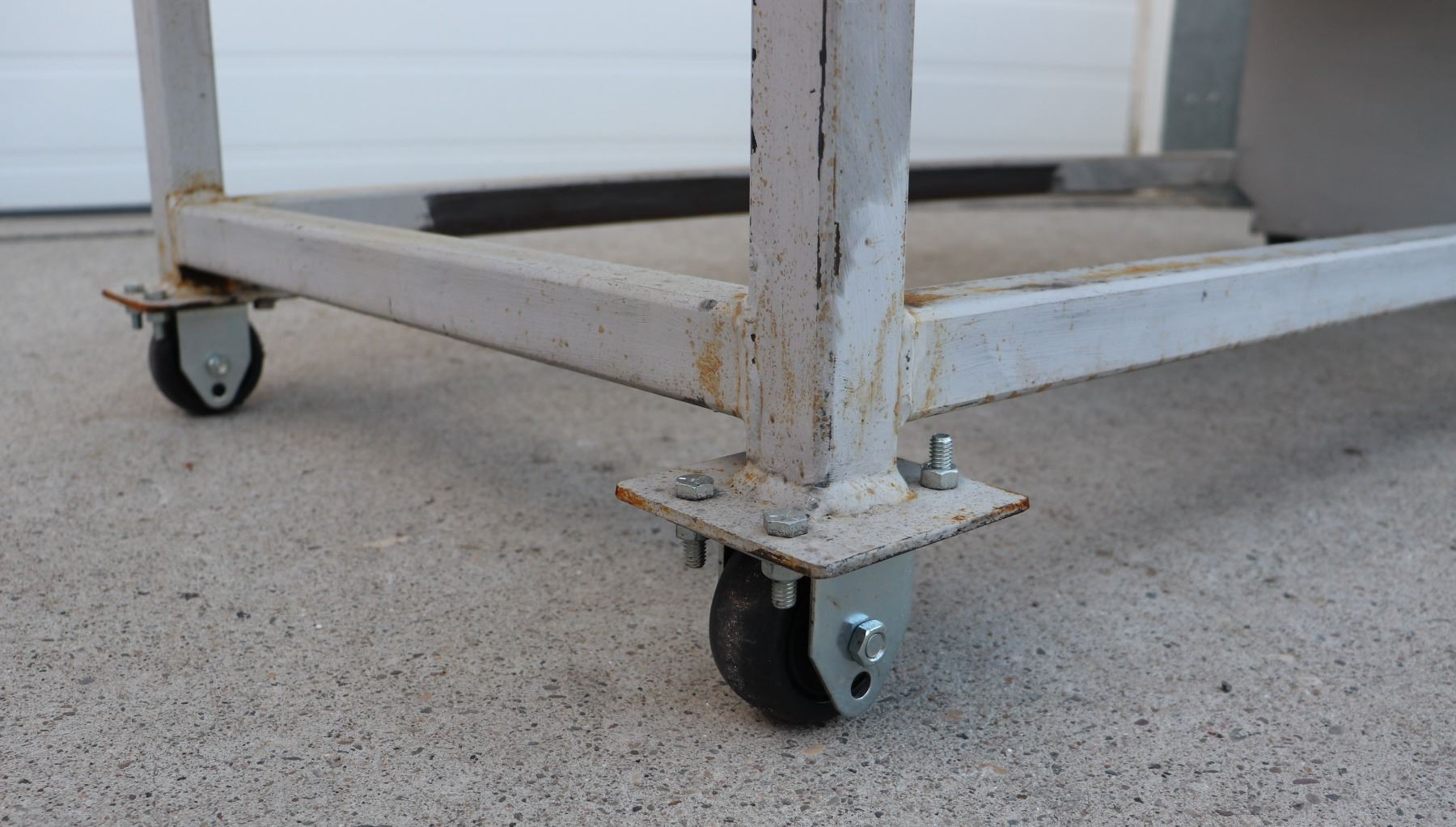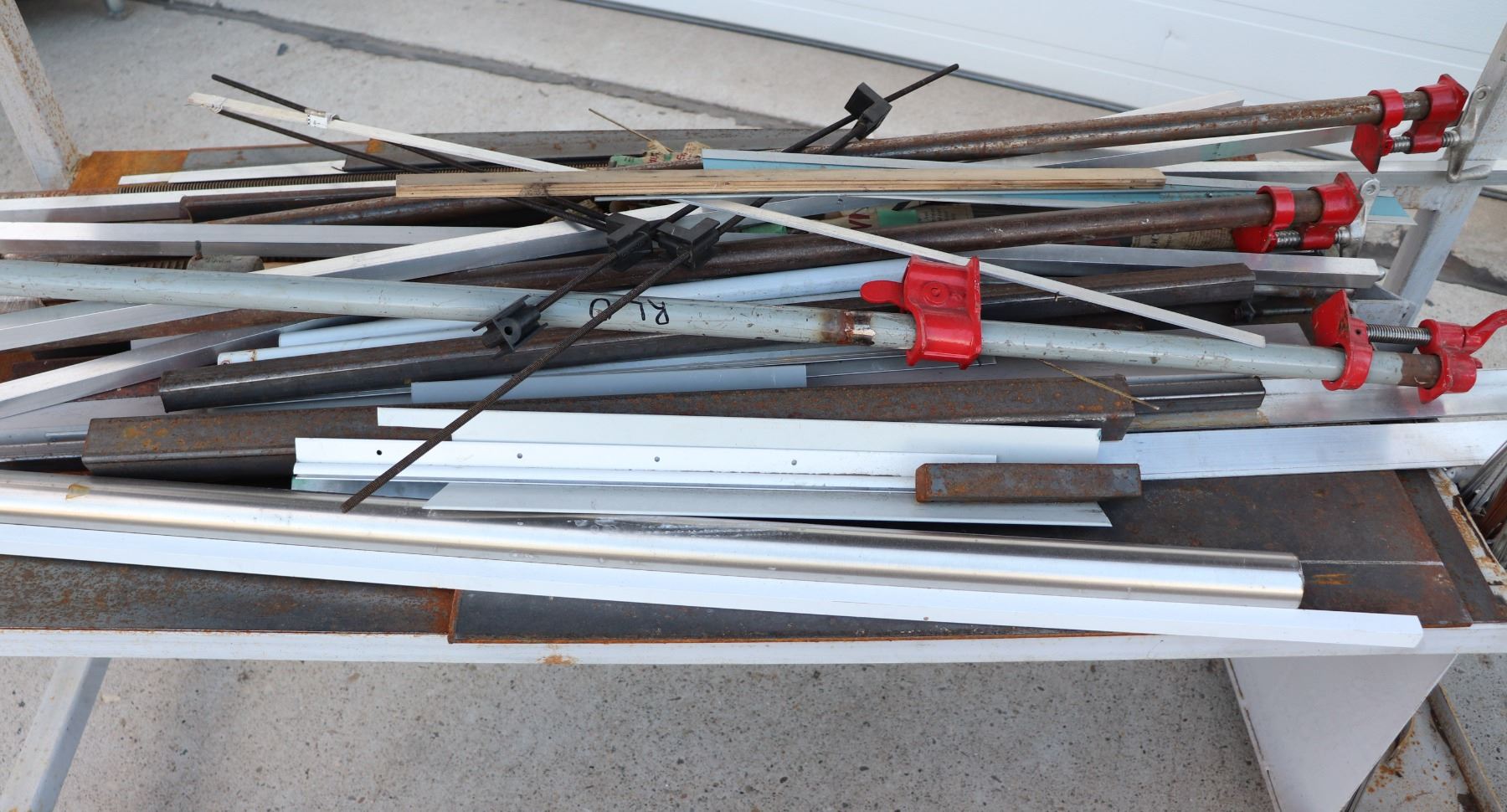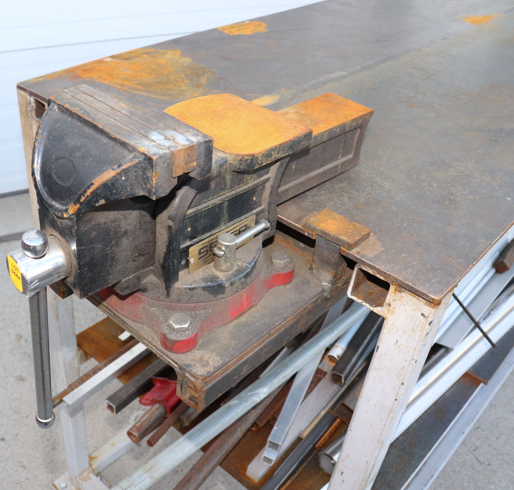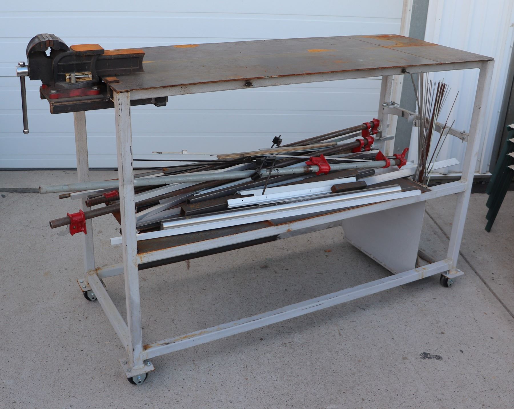 AND SOME BAR CLAMPS. (SCRAP METAL ON LOWER SHELF INCLUDED IN LOT). ON WHEELS. TABLE TOP APPROX 5' X 2' AND 3'5" TALL