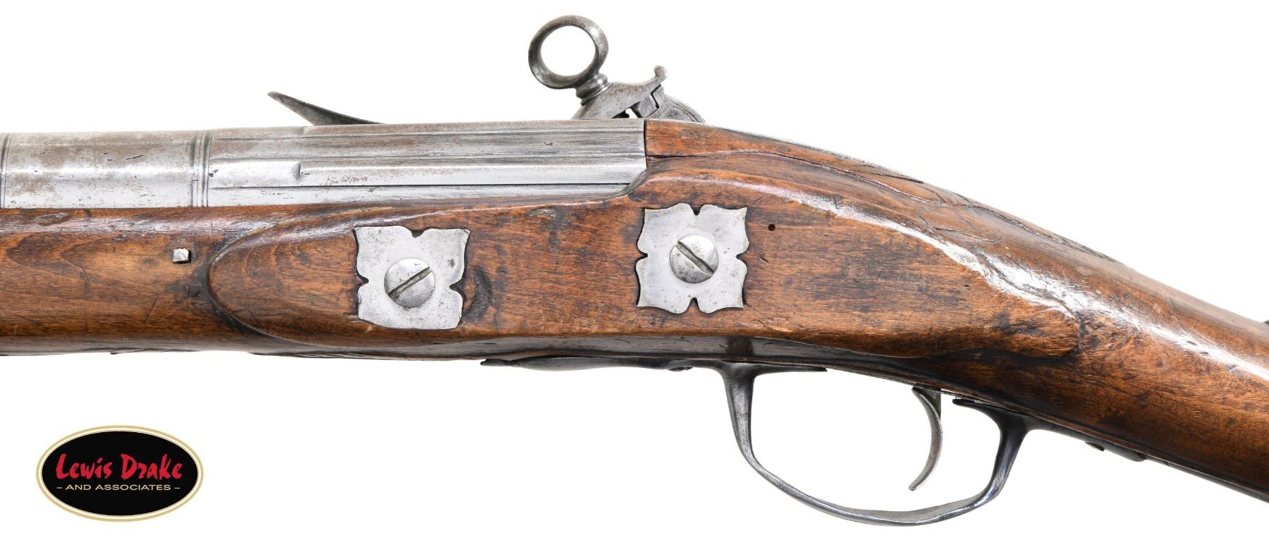 BARREL. Cal. 80. S# NSN. The 15-1/2" barrel has fluted rear section marked "LAZARINO COMINAZZO" (This famous barrel maker's mark is often counterfeited.) on top. Barrel transitions to round through two simple bands; round flared muzzle measures 1-3/4". Miquelet lock with external main spring has some decorative filing and engraving. Straight grip stock of plain European walnut is iron mounted. Raised mouldings are around most components except buttplate. Stock extends to muzzle and is reinforced by an iron band. Very early walnut ramrod has small steel button head and is held by multi-beaded pipe and matching thimble. CONDITION: good. Metal cleaned to silver gray. Stock with old finish; has newer oil rubbed in. Bore is good; a bit rusty. Lock is operable but cranky. Trigger guard does not fit inletting well. PROVENANCE: from the renowned collection of quality sporting arms from Lewis Drake together with inventory of Lewis Drake Associates. (01-26107/MGM). ANTIQUE. $3,000-5,000.