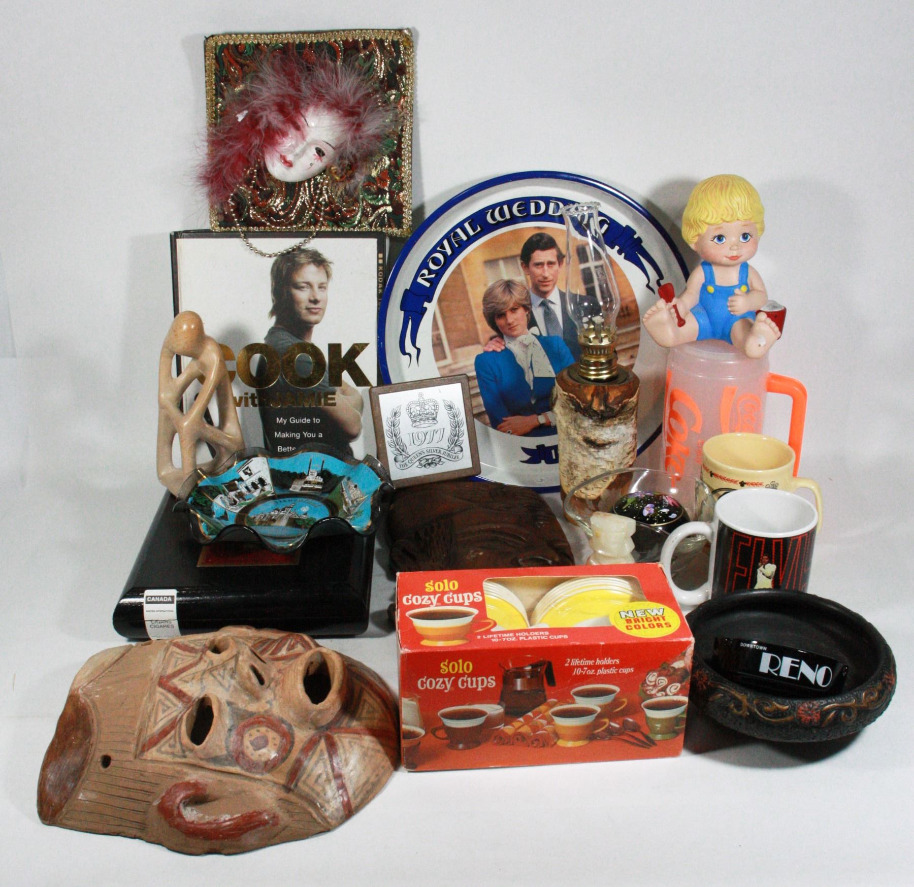 VINTAGE COKE HANDLED PLASTIC MUG, FIGURINES, DISHES, MUGS, ASHTRAYS ETC.