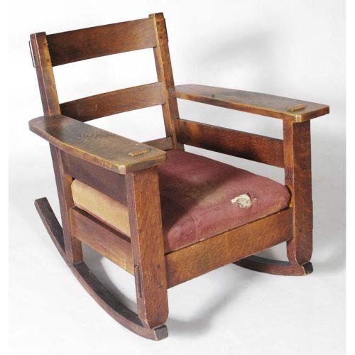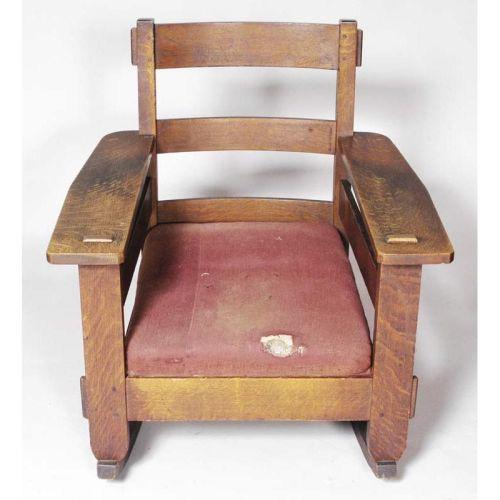 LARGE ARTS & CRAFTS OAK ROCKER attributed to Charles Stickley 33" wide, 36" high, 28" deep with through tenons and original finish, circa 1910 CONDITION REPORT: no damage or restoration, normal arm wear, cushion as-is, some crusty black residue on back.