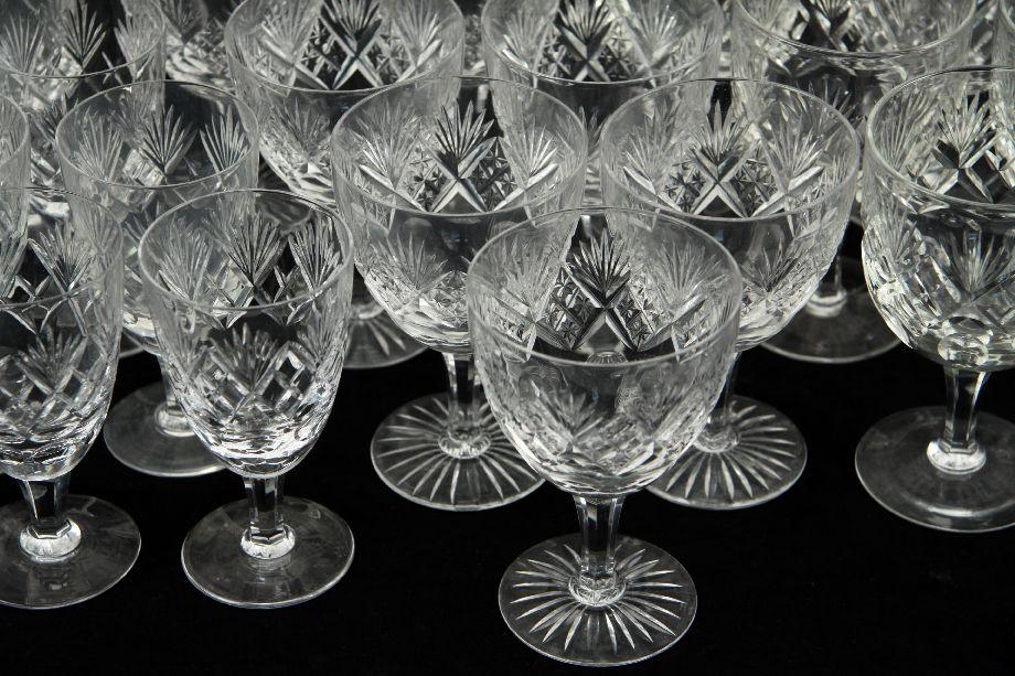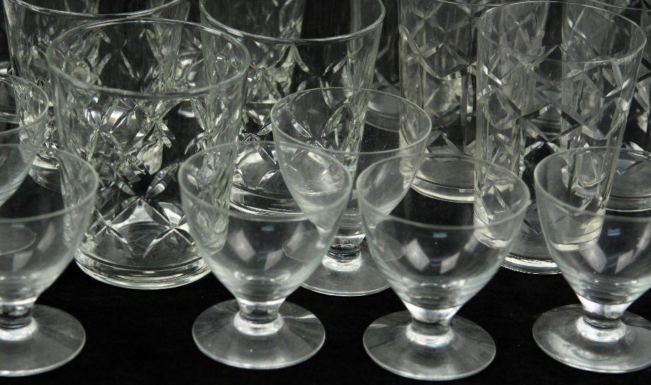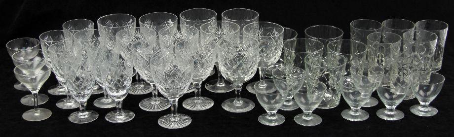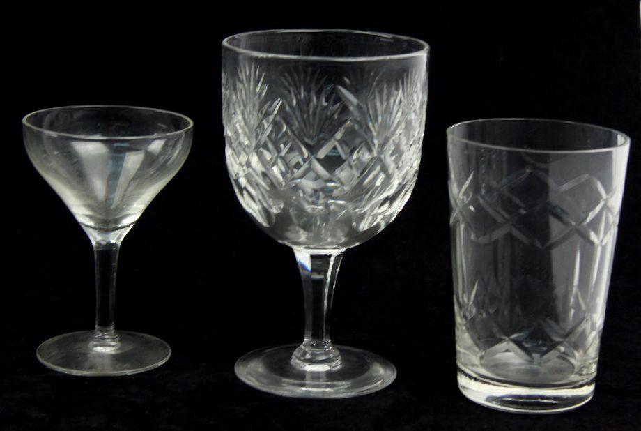 A mixed grouping of crystal including a pattern by Libbey. Pieces include: (5)5.75 water goblets, (7) 5.5 inch red wine goblets, (7) 5.25 inch white wine glasses, (7) 3 inch sherbet glasses, (3) 4 inch champagne glasses, (6) 4 inch rocks glasses (1 is chipped on rim) and (5) 4 inch highball glasses.