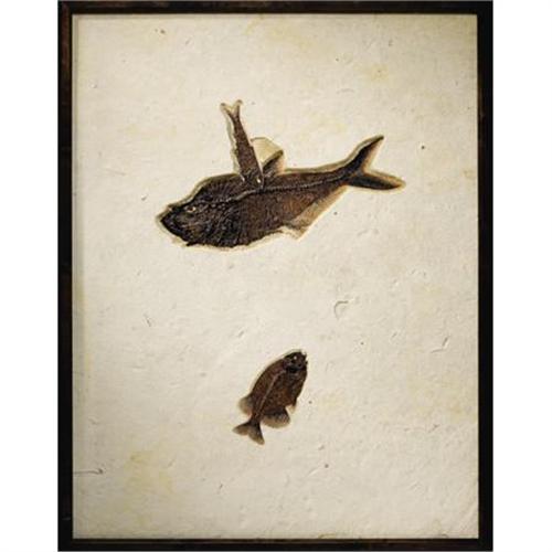 <B>LARGE MULTIPLE FOSSIL FISH PLATE</B></I><BR><BR> <I>Diplomystus dentatus, Phareodus sp., Knightia sp.<BR>Eocene<BR>Green River Formation, Wyoming</B></I><BR>The 25,000 square mile Green River formation in Wyoming is one of the most abundant and well-preserved sources of freshwater fossils in the world, producing some 19 genera of fish from the Eocene epoch, 35-55 million years ago. Presented here on one matrix are three examples of the more common inhabitants of this prehistoric lake, uncommon in their finely-detailed preparation and superb presentation. The 19½-inch long Diplomystus, with its distinctive upturned mouth, was a relative of the modern-day herring and sardine, and is often found in close proximity to one of its favorite snacks, the small and slender Knightia; dynamically overlapping the larger fossil, the example here measures 7 inches long. Hovering onto the scene is a third fish, an 8-inch long Phareodus with its distinctive dorsal and anal fins, and together the three provide a fine aesthetic picture of the variety of life to be found in these ancient waters. The 32 x 41 inches natural matrix plate comes framed in wood and ready to hang.<BR><BR><b>Shipping:</b> Requires 3rd Party Shipping (<a target="_blank" href="http://www.heritageauctions.com/common/shipping.php">view shipping information</a>)