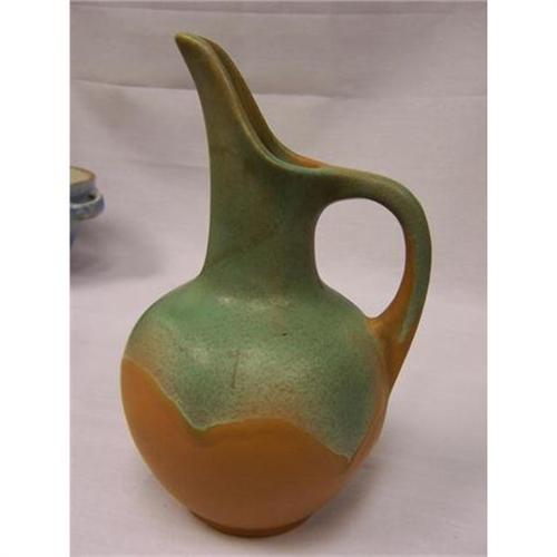 THIS IS A WONDERFUL PIECE OF GREEN AND ORANGE, MUNCIE DRIP EWER. THIS POTTERY COMPANY WAS ONLY OPEN A FEW YEARS SO THAT LIMITS THE SUPPLY OF POTTERY 1922-1935.CHARLES O. GRAFTON WAS THE OWNER AND MADE THE POTTERY OF HEAVY CLAY.THE BOTTOM OF THIS PIECE IS NOT MARKED, BUT HAS PAINT ON THE BOTTOM OF IT, LIKE ALL MUNCIE POTTERY.THIS WOULD BE A NIECE PIECE TO ADD TO YOUR COLLECTION.