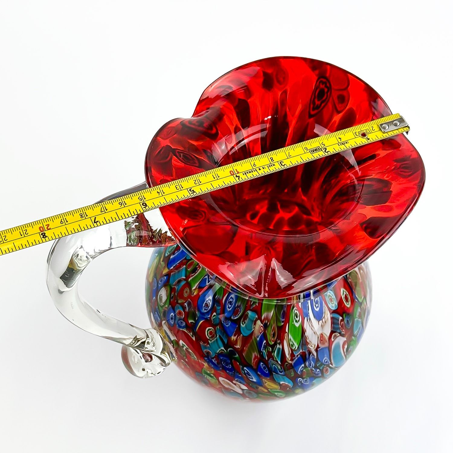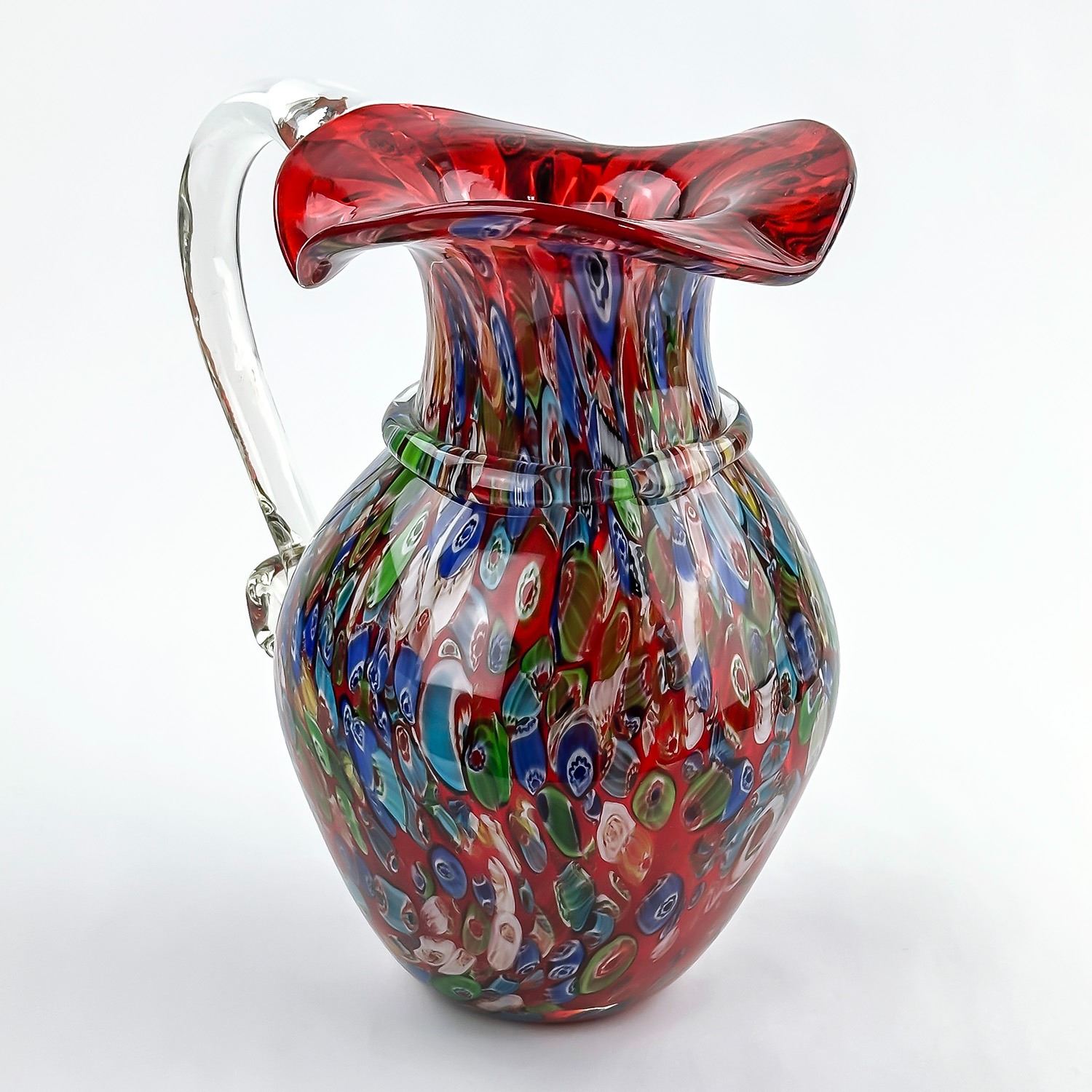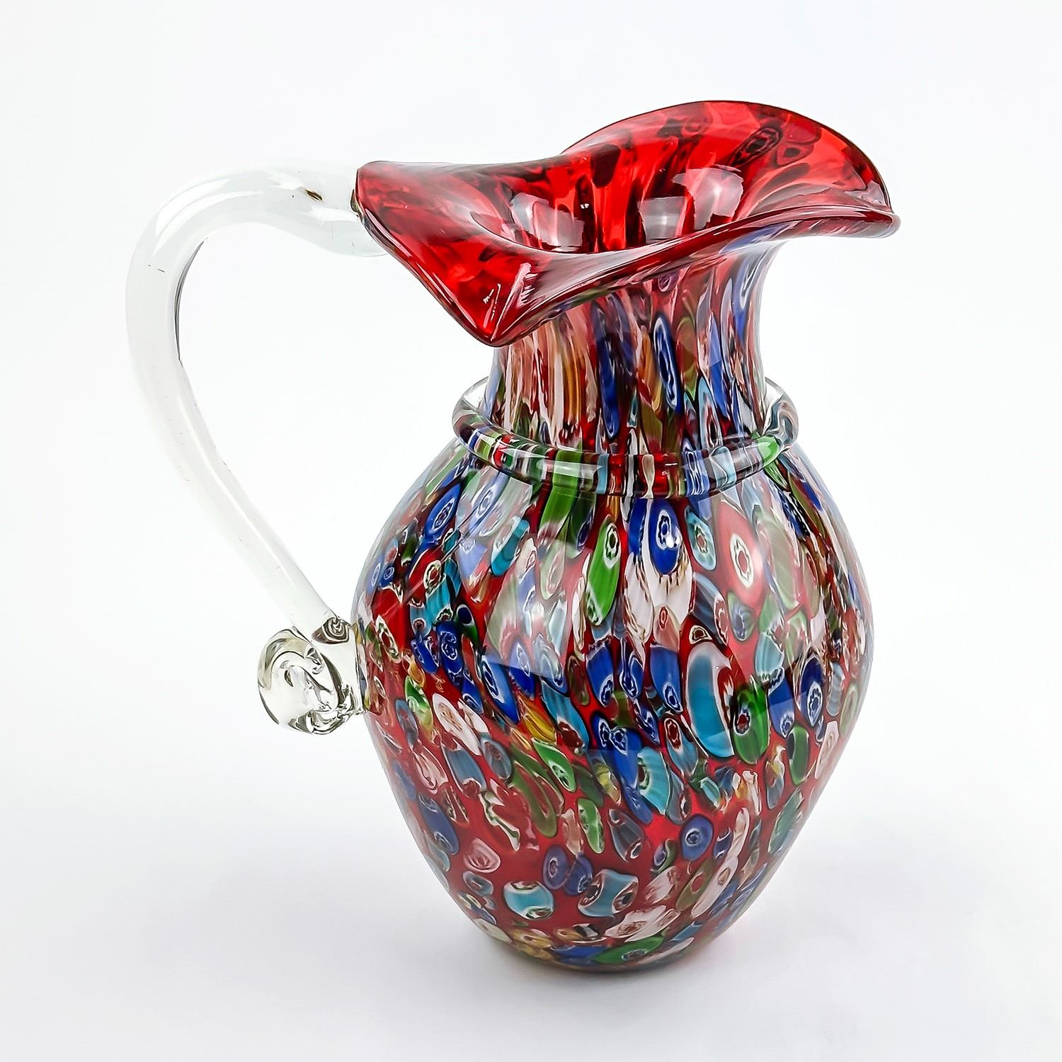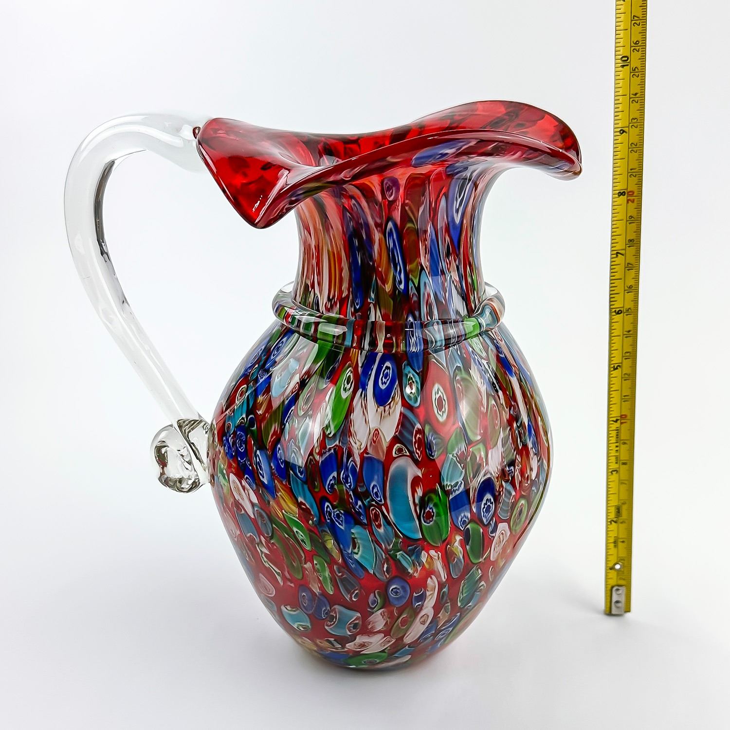 #8008 - LARGE 2.8 KG (6.2 POUNDS) MILLEFIORI HAND CRAFTED BLOWN ART GLASS PITCHER. KITCHEN KITCHENWARE BAR BARWARE DECOR BLOWN GLASS PITCHER SCULPTURE. MEASURES: 9.5”(24 CM) TALL BY 8.5” (21.5 CM) WIDE - SPOUT TO HANDLE. WIDEST MAIN BODY DIAMETER IS APPROXIMATELY 6” (15 CM)