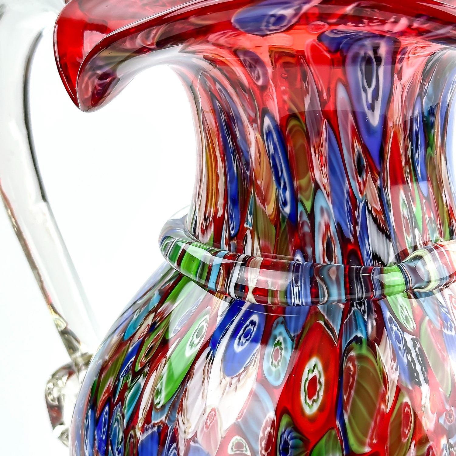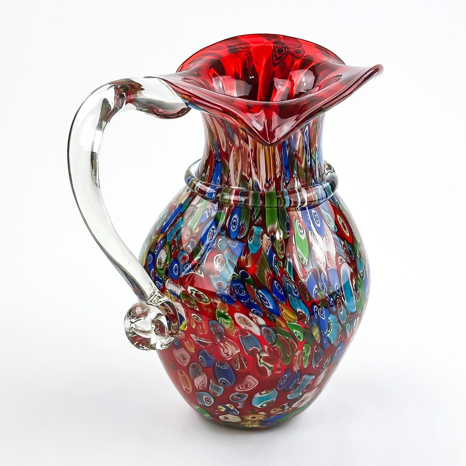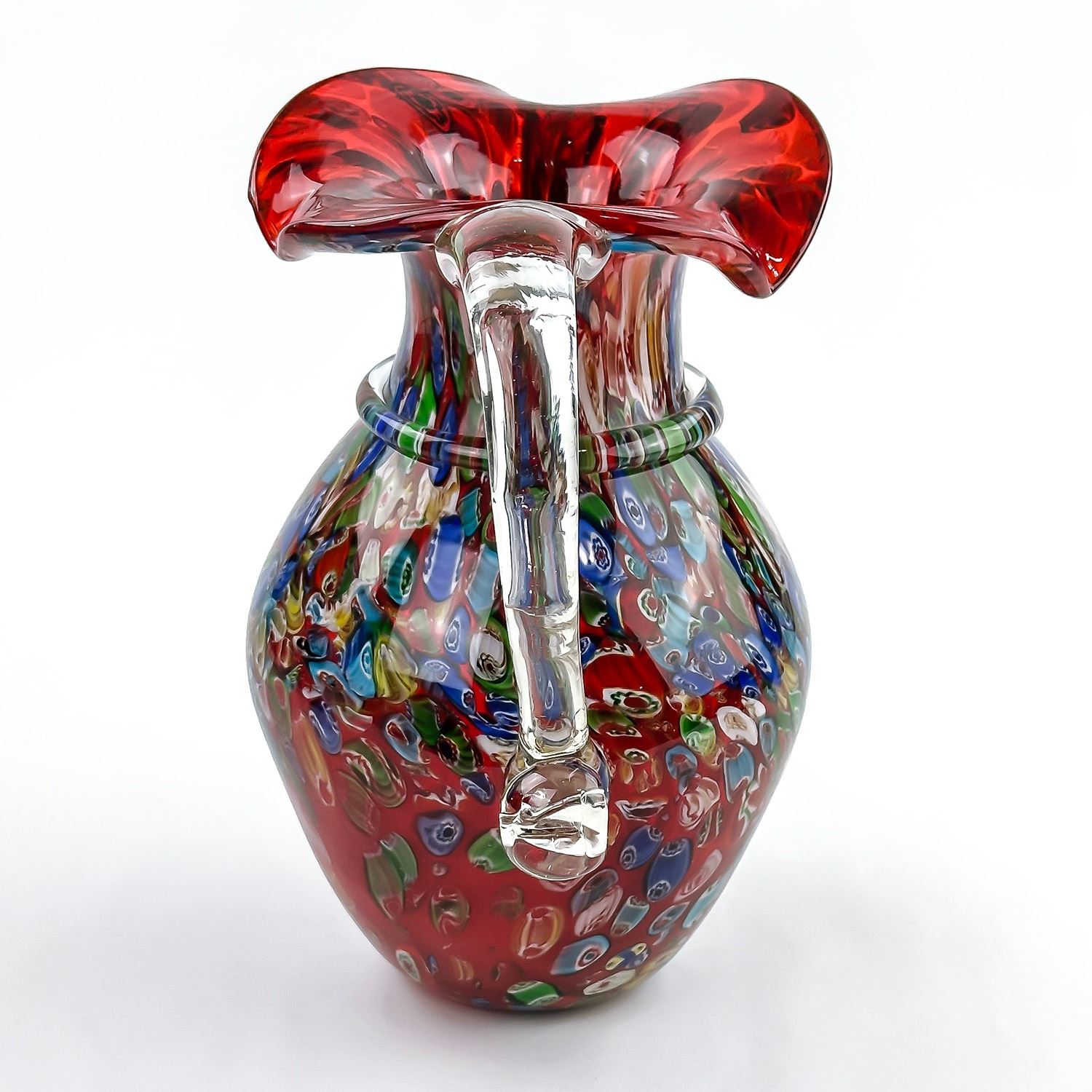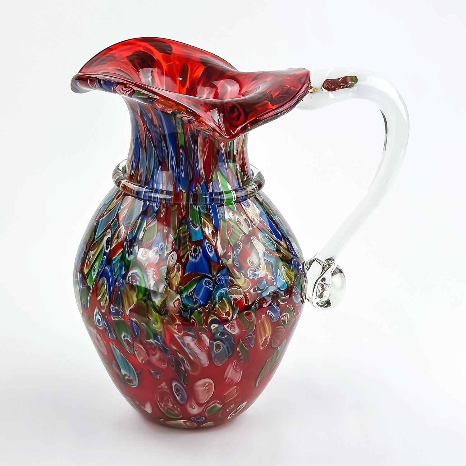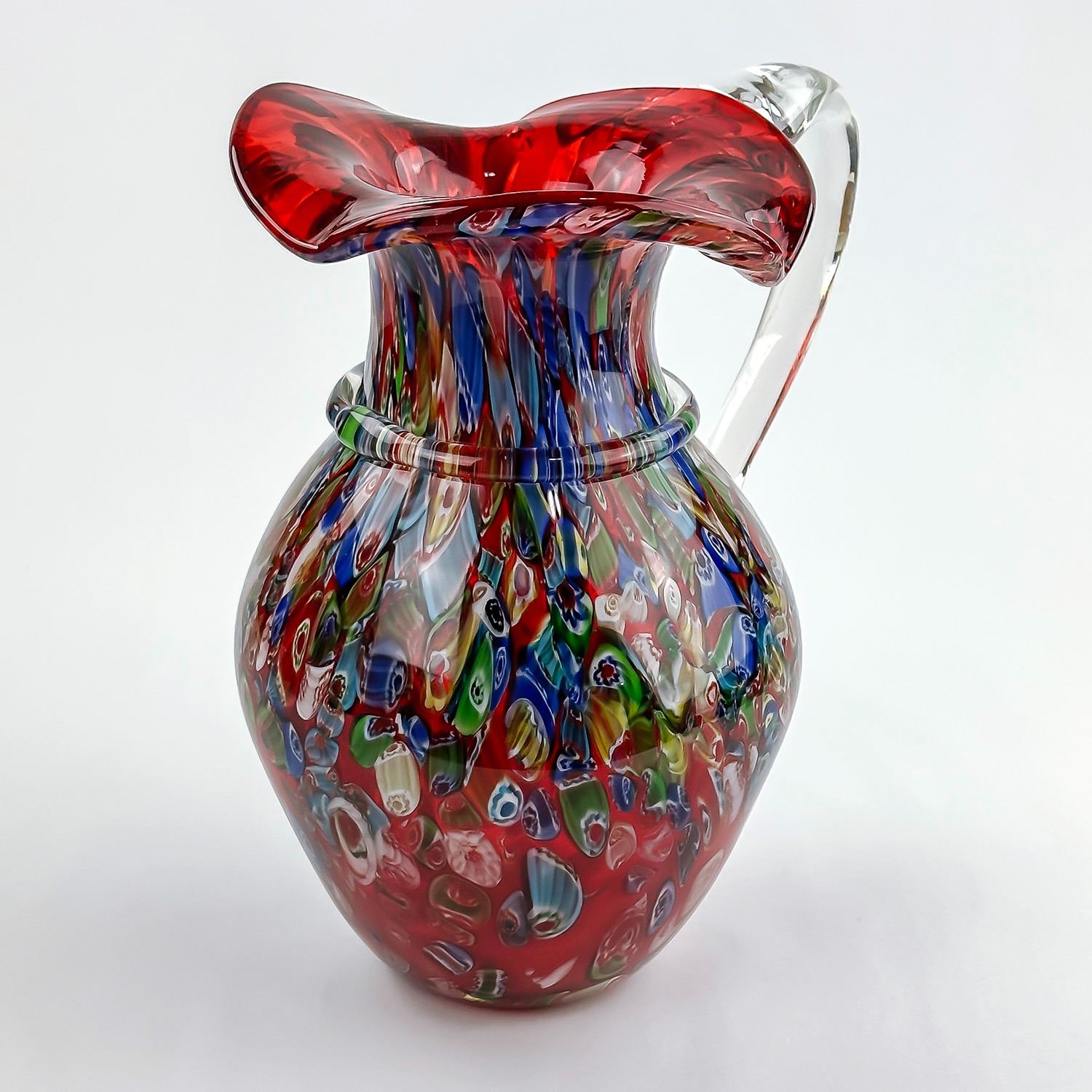 #8008 - LARGE 2.8 KG (6.2 POUNDS) MILLEFIORI HAND CRAFTED BLOWN ART GLASS PITCHER. KITCHEN KITCHENWARE BAR BARWARE DECOR BLOWN GLASS PITCHER SCULPTURE. MEASURES: 9.5”(24 CM) TALL BY 8.5” (21.5 CM) WIDE - SPOUT TO HANDLE. WIDEST MAIN BODY DIAMETER IS APPROXIMATELY 6” (15 CM)