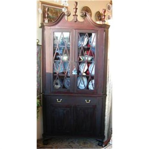 Just beautiful 2 piece Mahogany Corner Cupboard, ca. 1860. Three handcarved flame finials on top make this a stately 93" high piece. Original seeded glass, original finish with very faint alligatoring, chamfered drawer. This piece is not perfect; there is an escutcheon missing around the keyhole on the bottom right door, the lock on the bottom right door is missing and there is a 2" indent on the top right side, about 12" down. Other than that this piece is in exceptional condition for the age. Brass hardware, gorgeous Ball and Claw feet. Additional pictures available on request (I can only post 4). Working lock and key for the top cabinet. Four shelves on top, with grooves for plates, to display your china. Two shelves on the bottom. This is a two piece cabinet which will make it easier for shipping. An absolutely stunning piece!