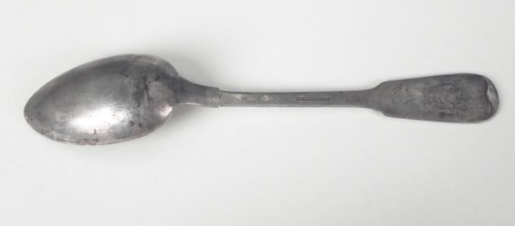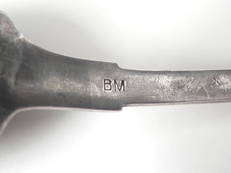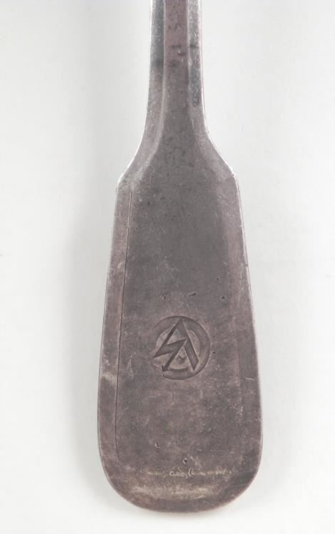LARGE NAZI "SA" ENGRAVED SERVING SPOON-MAKER MKD 8 3/4" LONG-FRONT HANDLE HAS "SA" STORMTROOPERS INSIGNIA--REVERSE HAS MAKER MARK "GOWE--VERSILBERT"