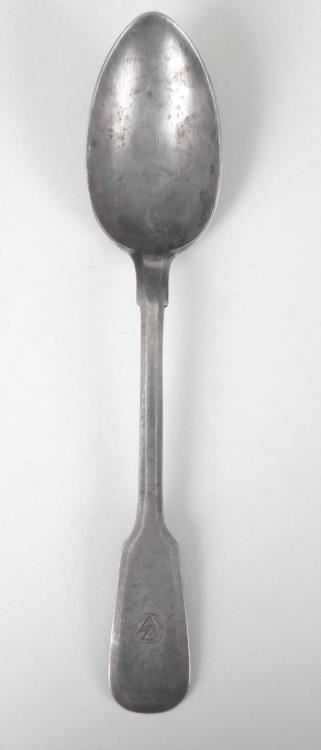 LARGE NAZI "SA" ENGRAVED SERVING SPOON-MAKER MKD 8 3/4" LONG-FRONT HANDLE HAS "SA" STORMTROOPERS INSIGNIA--REVERSE HAS MAKER MARK "GOWE--VERSILBERT"