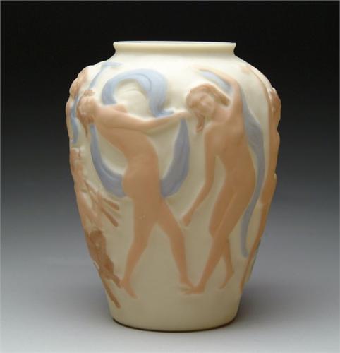 LARGE NUDE PHOENIX VASE. This wonderful tall phoenix vase with creamy background has pastel blue highlights featuring a harem of beautiful nude women and one lucky satyr. SIZE: 12 in. t. CONDITION: Generally very good to excellent. 5-61521