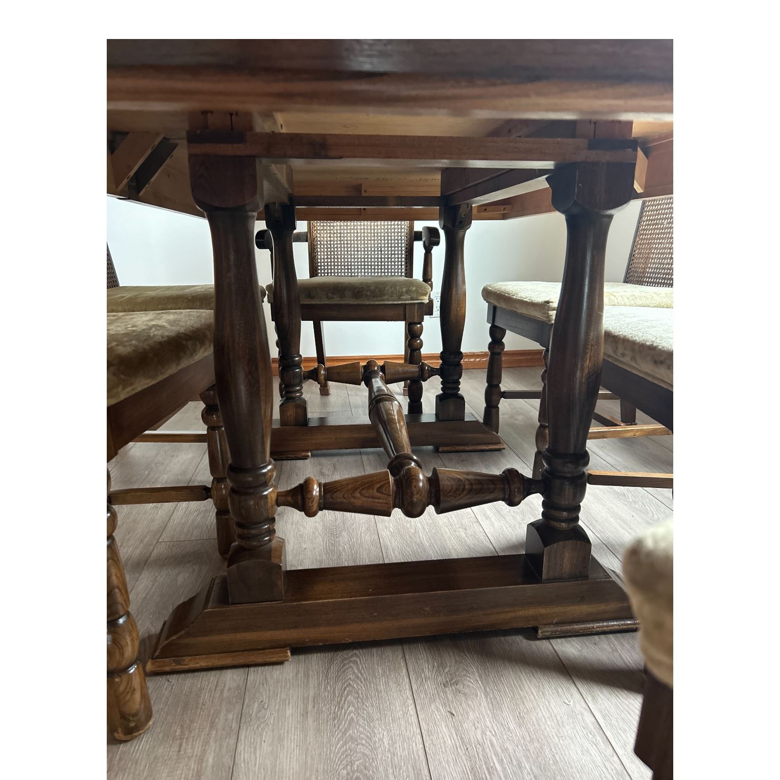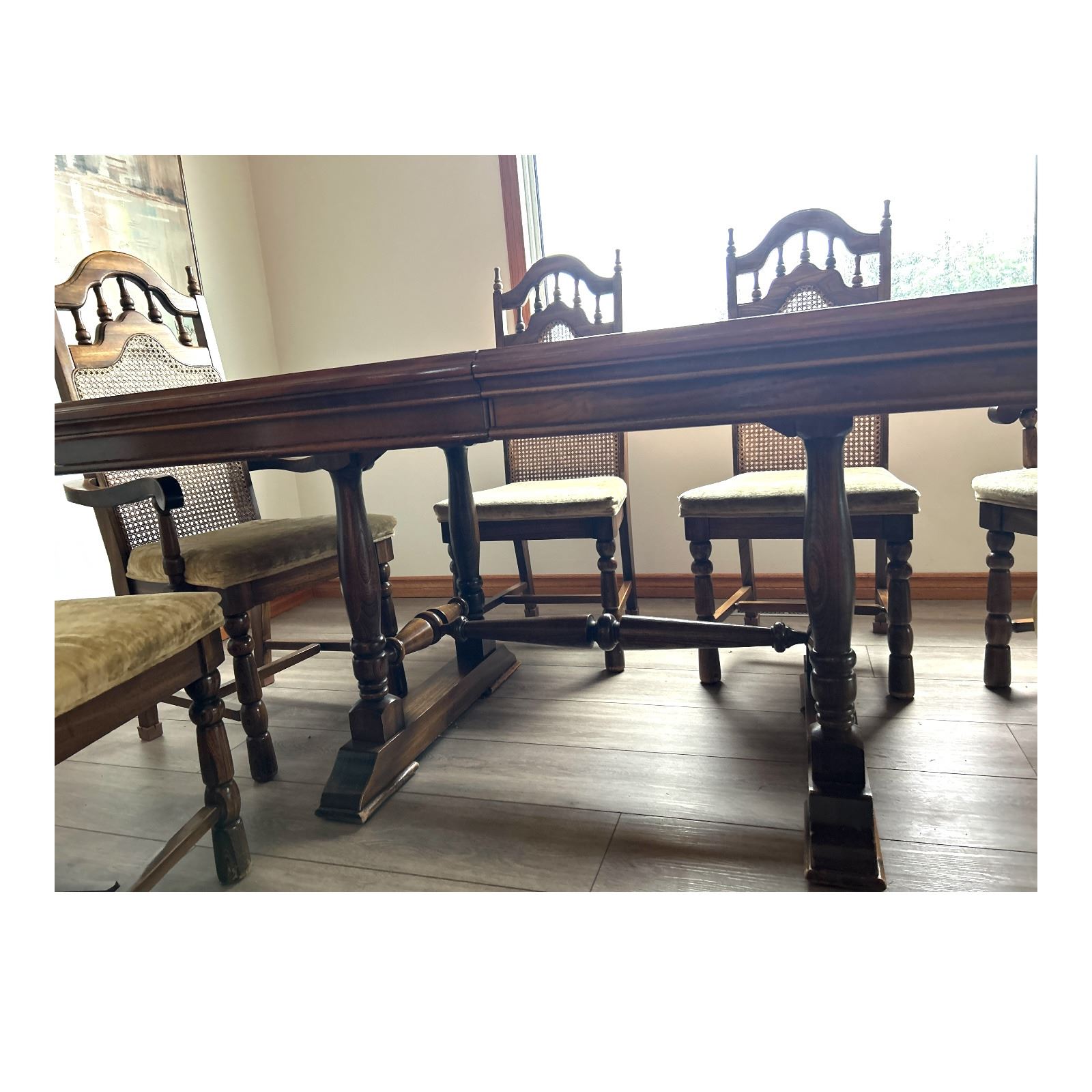 Blue along table edge is a reflection only - comes with 2 leafs - chairs not included but available in Lot 348 - NO SHIPPING / PICKUP ONLY