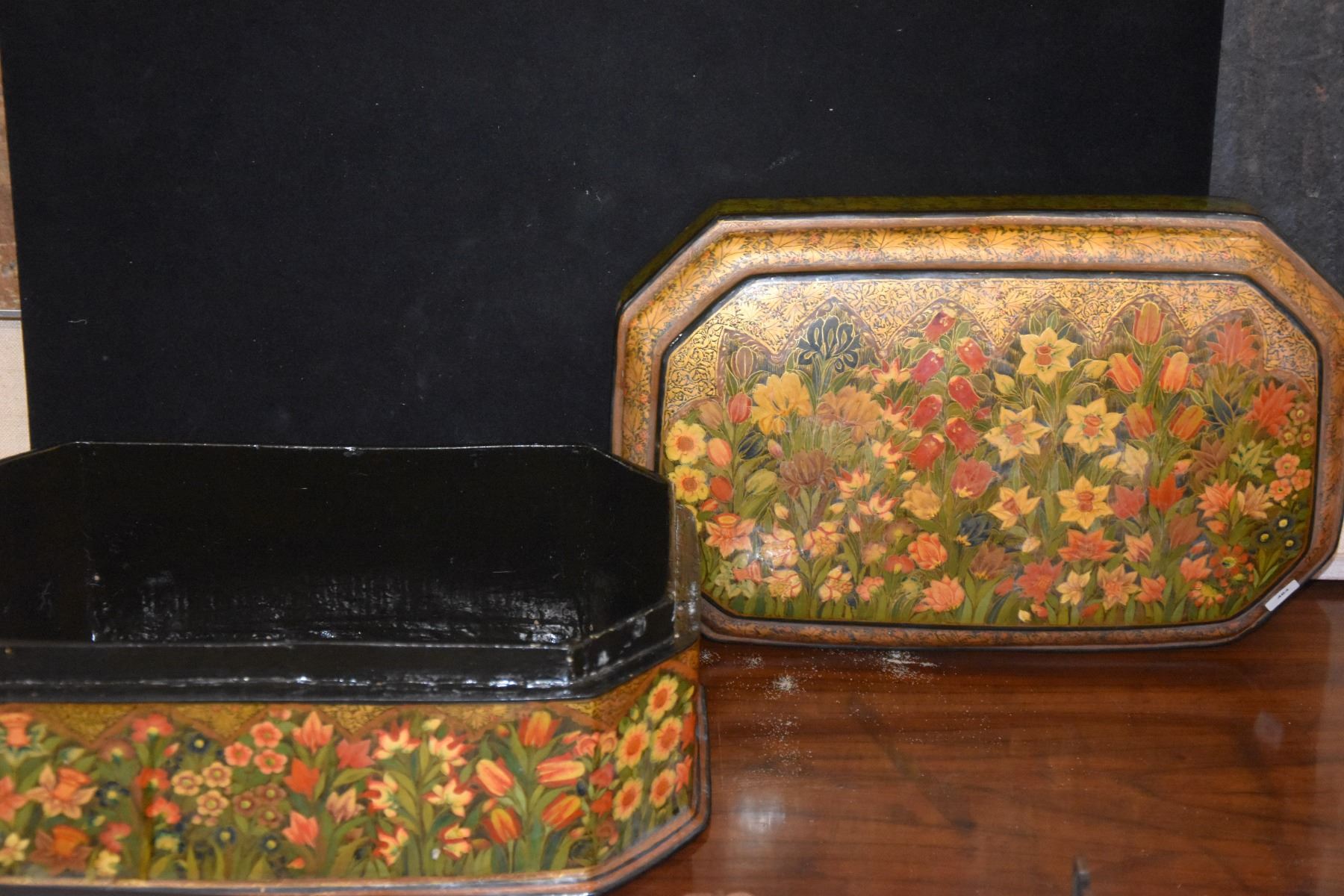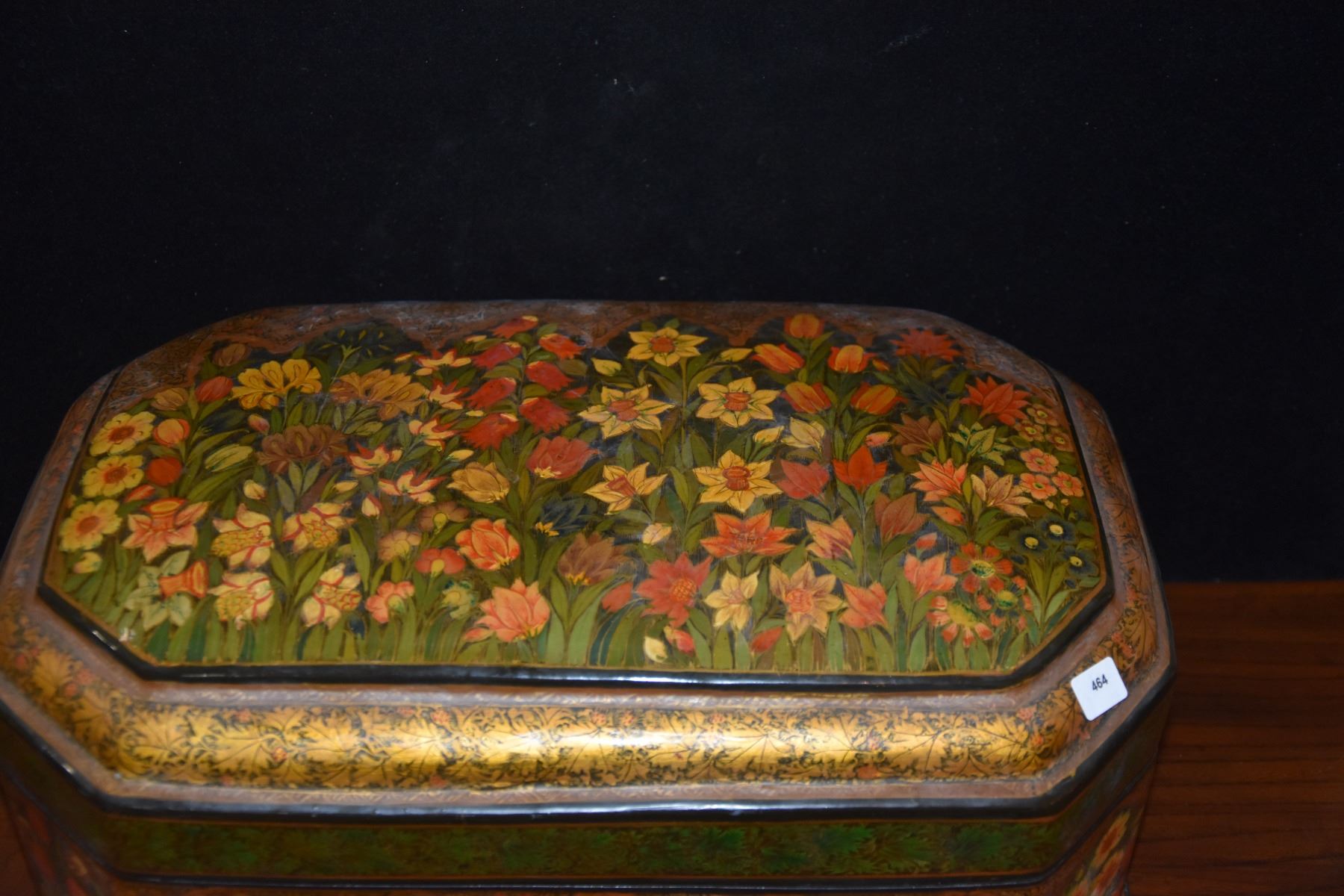 LARGE OCTAGONAL INDIAN/KASHIMIRI HAND PAINTED PAPIER-MACHE LACQUERED BOX W/BLACK INTERIOR, 20TH CENT