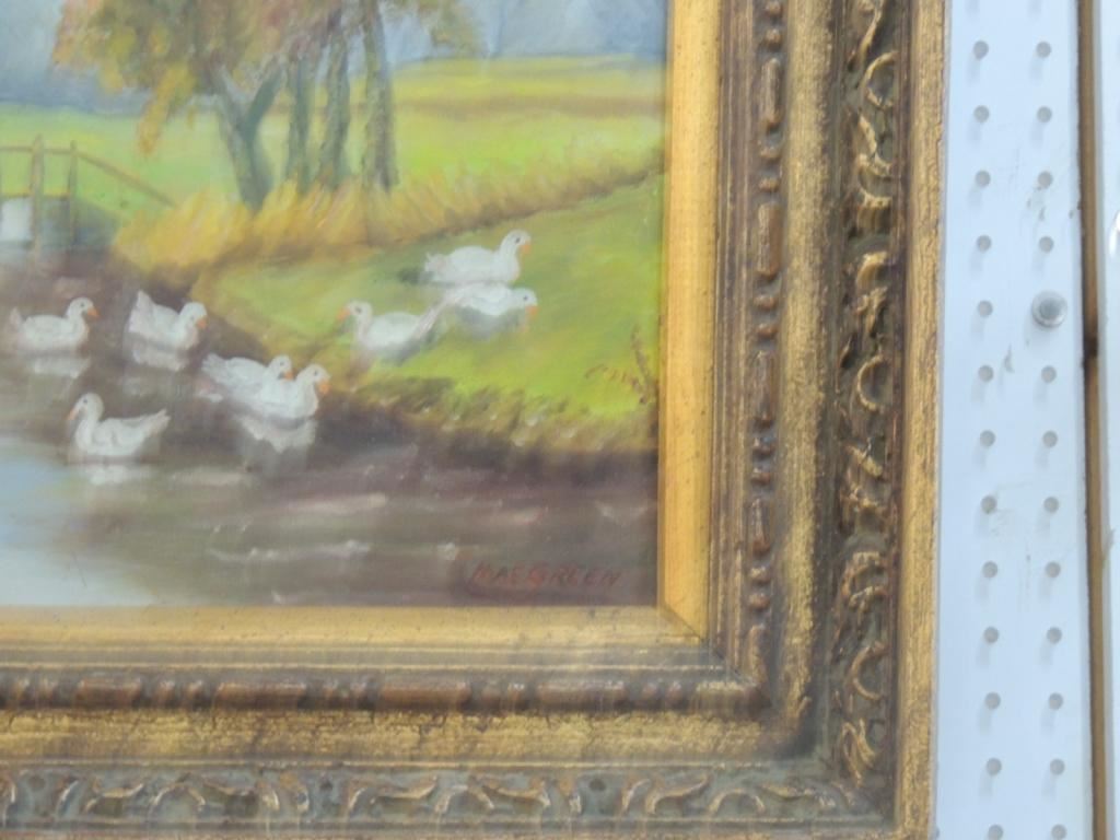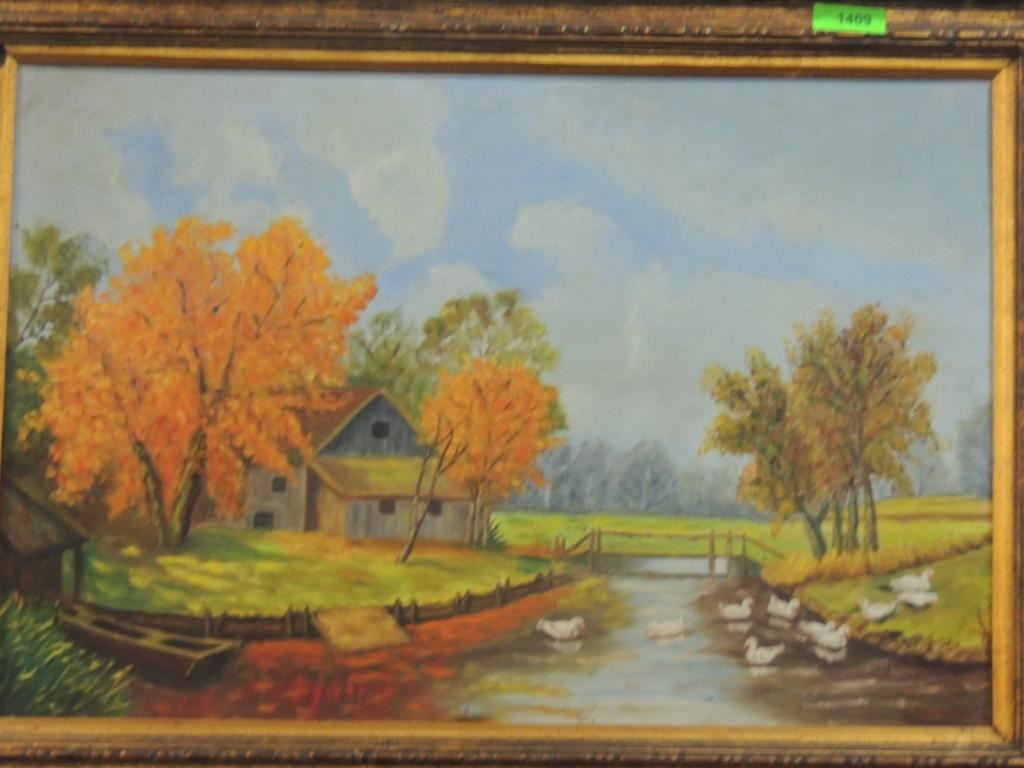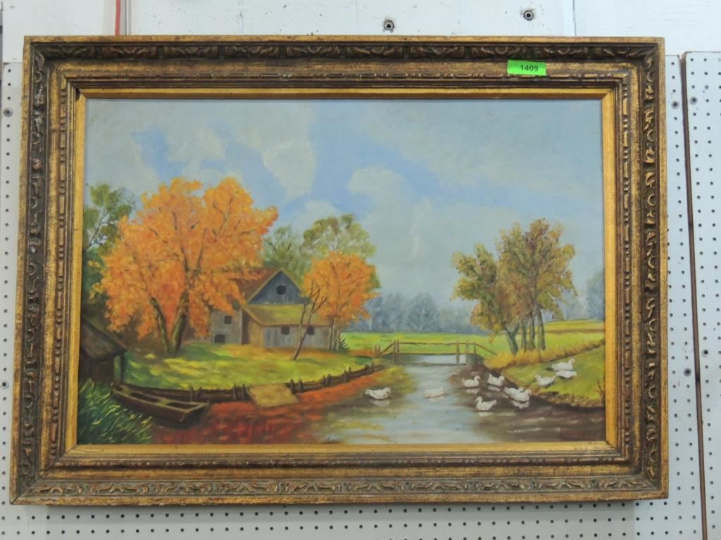 COUNTRY BARN ALONG STREAM WITH DUCKS. BRIDGE WARM COLORS LARGE THICK WOODEN FRAME. AS SHOWN. SEE PHOTO FOR MORE DETAILS.