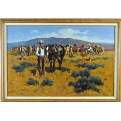 LARGE OIL ON CANVAS. Cowboys on horses by Bob Tommey. Tommey, born in 1928, was a member of the Texas Cowboy Artist Association. This painting depicting three cowboys with a corral of horses with a southwestern landscape. Bob signed in lower left "Bob Tommey, 71”. Letter from Tommey accompanies the painting. Framed in a contemporary oak frame. SIZE: 35-1/2” x 23-1/2”. CONDITION: Generally excellent. 8-87207
