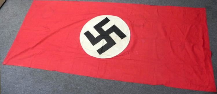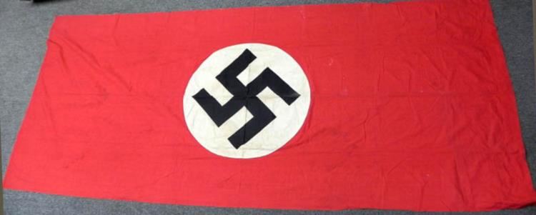 OFFERED HERE IS A LARGE ORIGINAL NAZI PARTY BANNER--112X48"--DOUBLE SIDED--HUNG FROM BUILDING. MULTI-PIECE--DOUBLE SIDED--A COUPLE OF LIGHT STAINS--US GI SENDBACK--HAS SLEEVE ON TOP FOR HANGING.