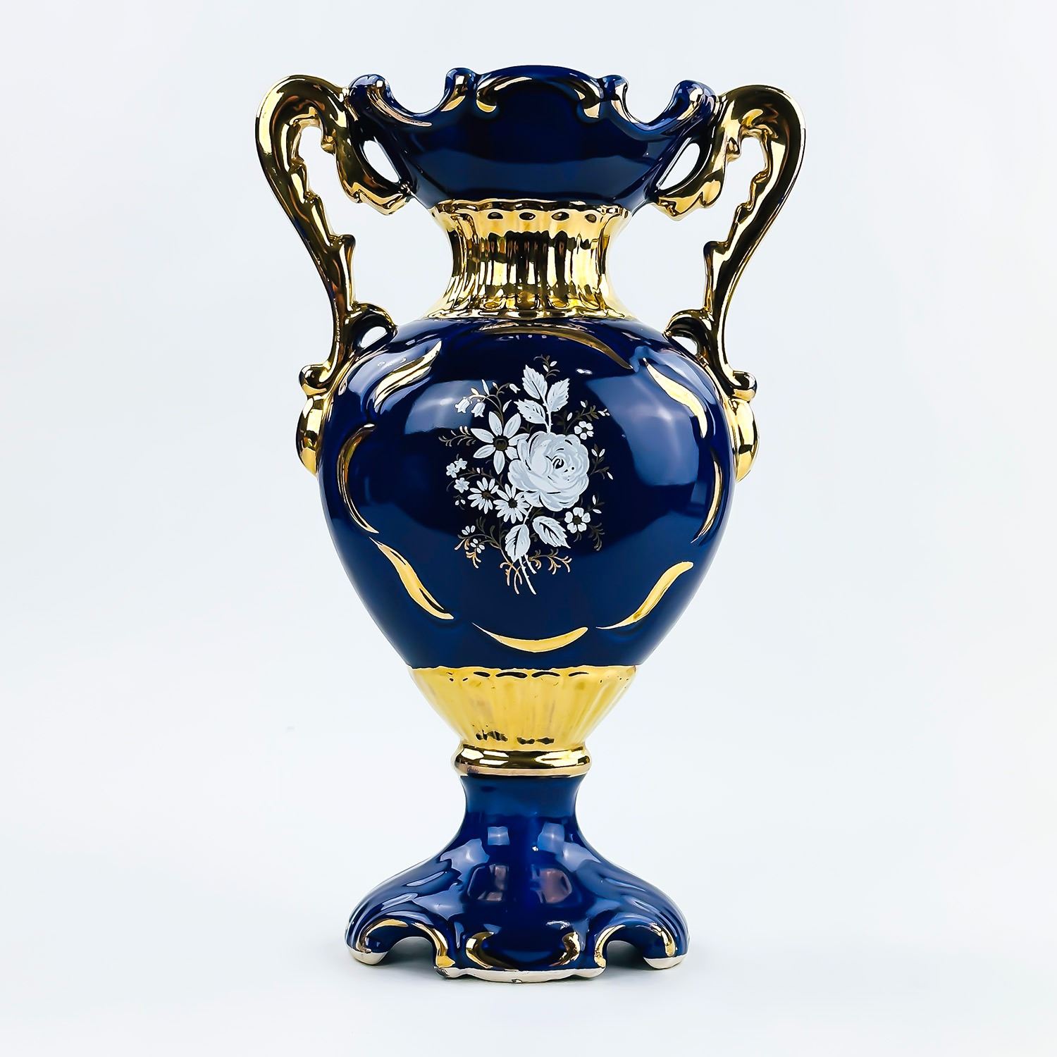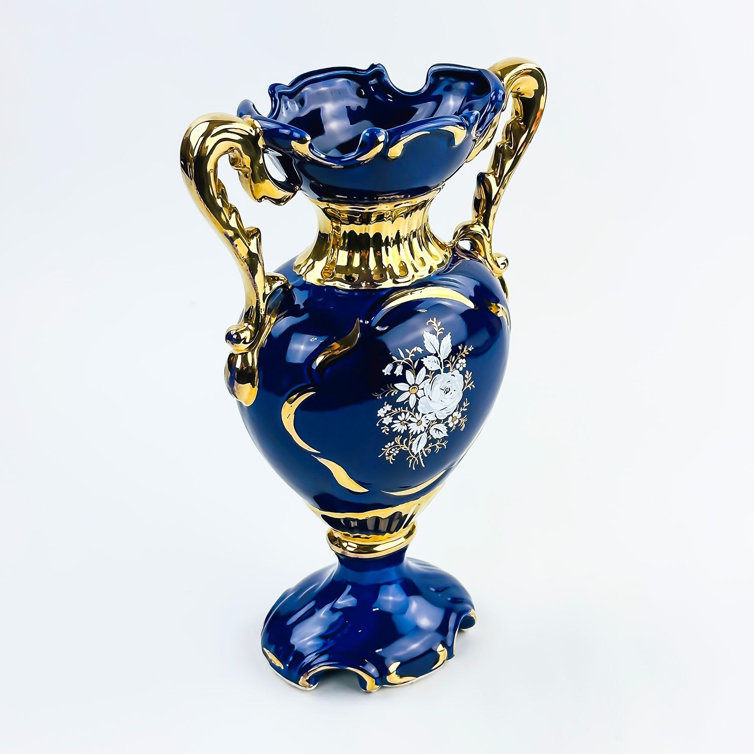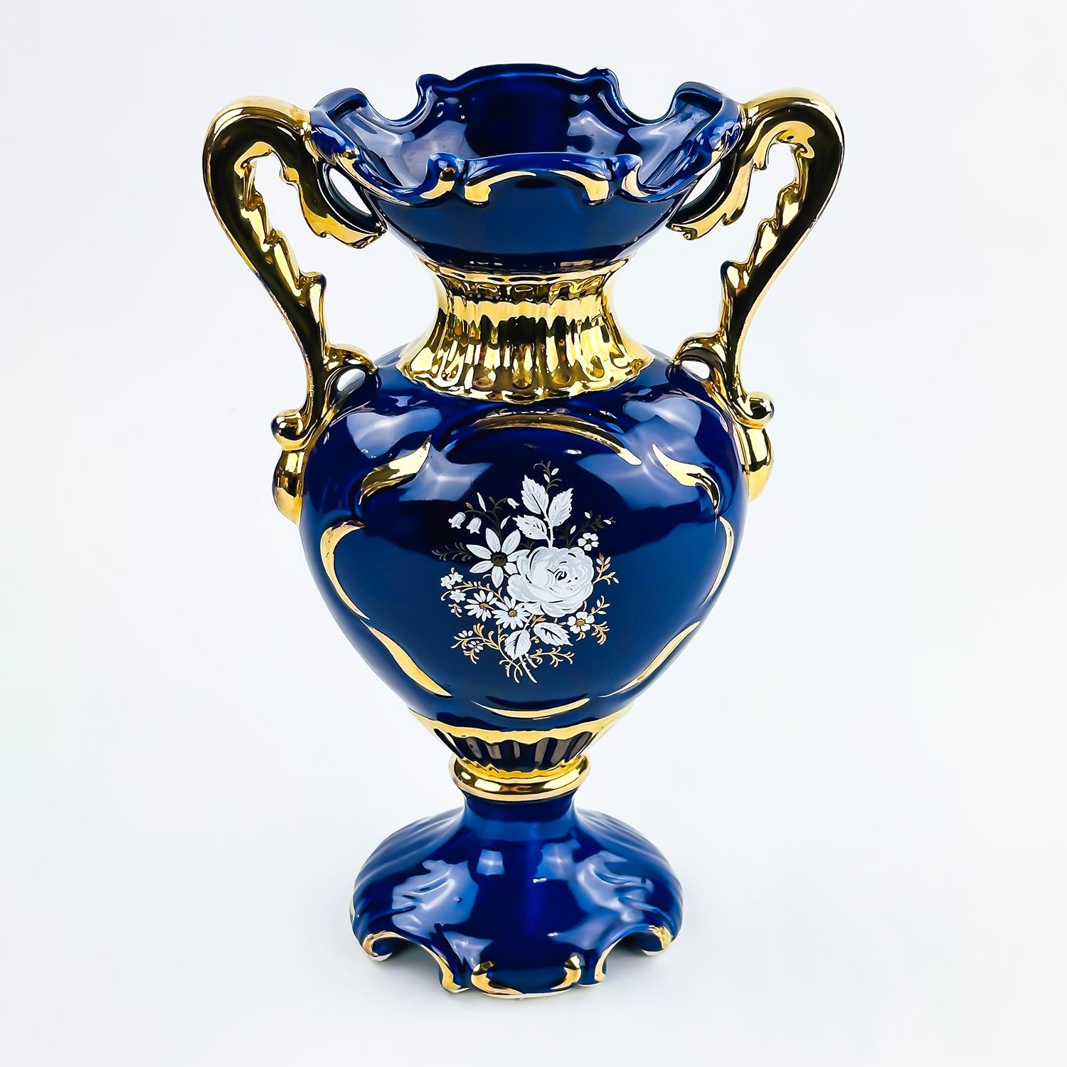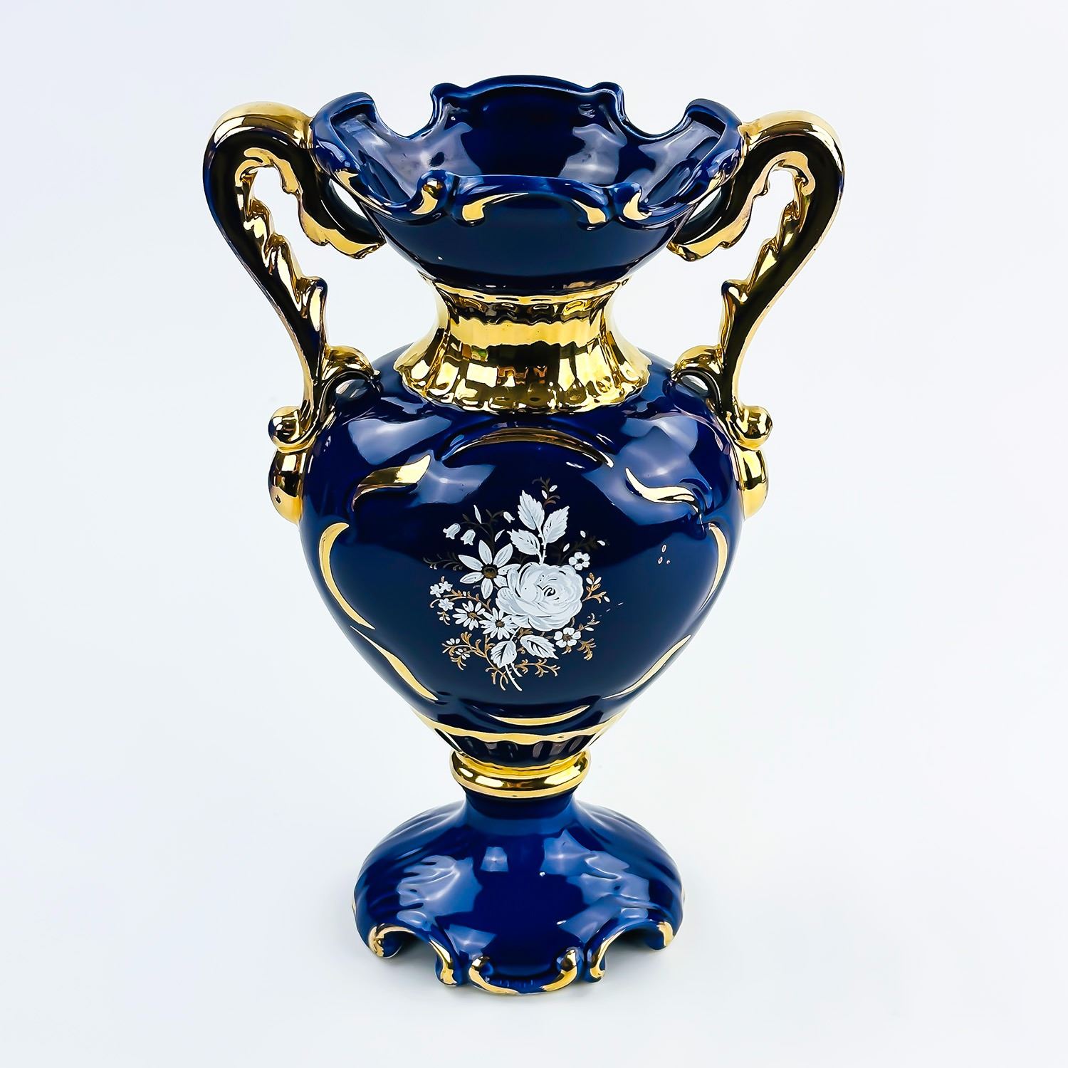 #8040 - UNMARKED 10.75” TALL TWO HANDLED COBALT BLUE PORCELAIN VASE. GOLD TRIM WITH HAND PAINTED FLORAL DESIGNS ON BOTH SIDES. MEASURES: 10.75” (27 CM) TALL BY 6.75” (17 CM) WIDE - HANDLE TO HANDLE AND 3.75” (9.5 CM) DEPTH