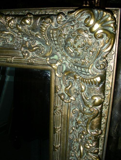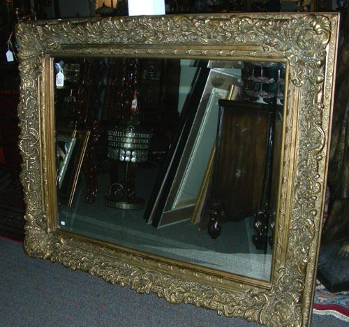 Beveled glass mirror with heavy ornate frame. Overall 51" x 63"