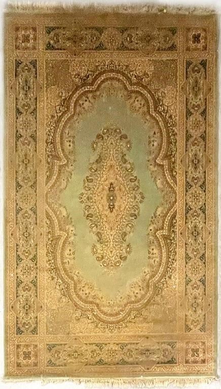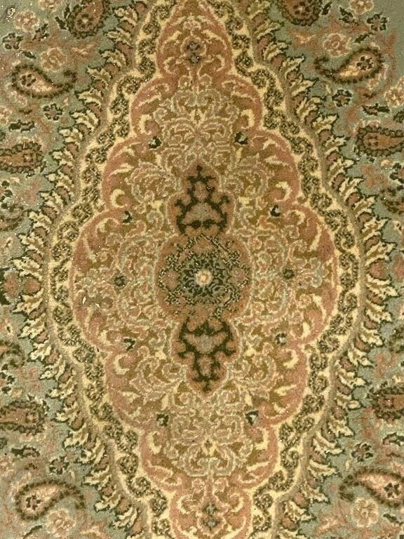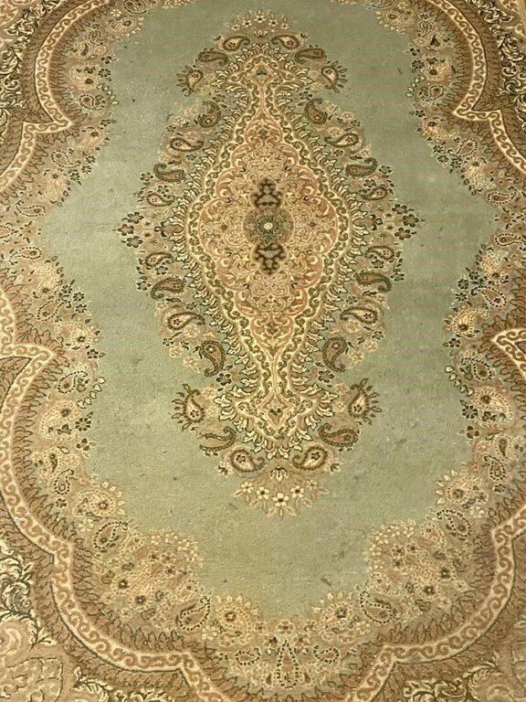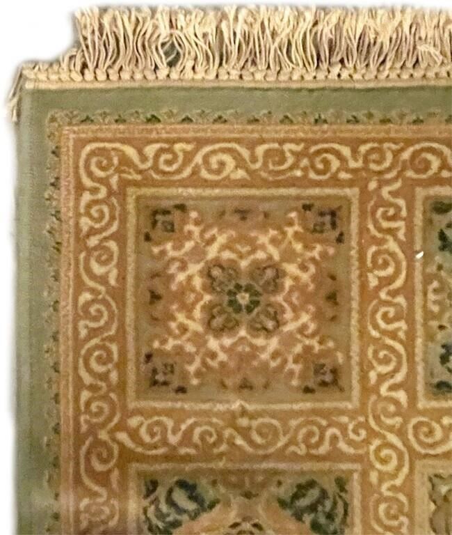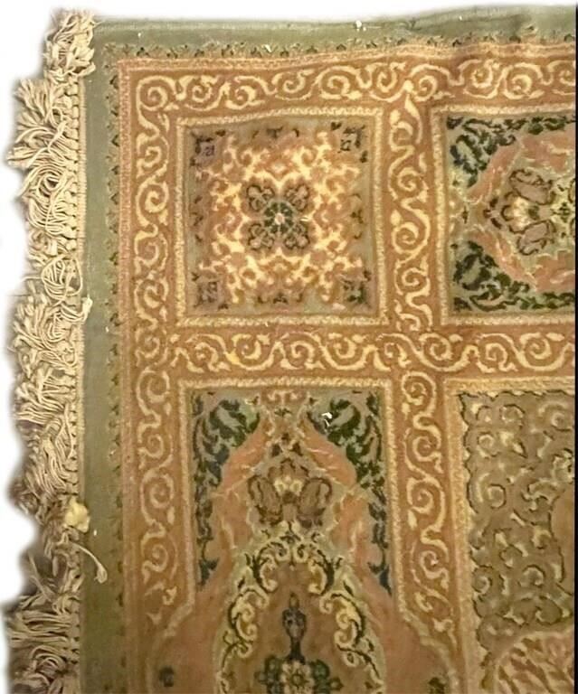 Large ornate Persian hand-knotted area rug with red yellow and green accents. Rug measures ~79 X 102" Rug has tassels on two ends.