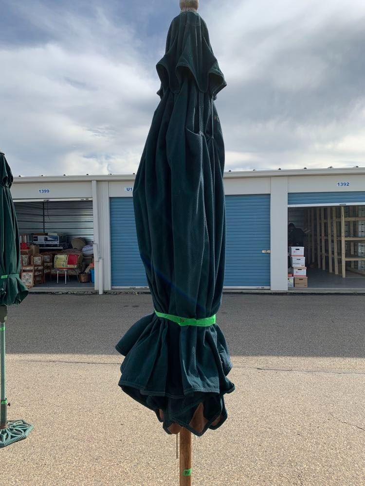 LARGE OUTDOOR UMBRELLA WITH STAND. STAND WEIGHS IN EXCESS OF 20LB. UMBRELLA HEIGHT IS 8' 7"