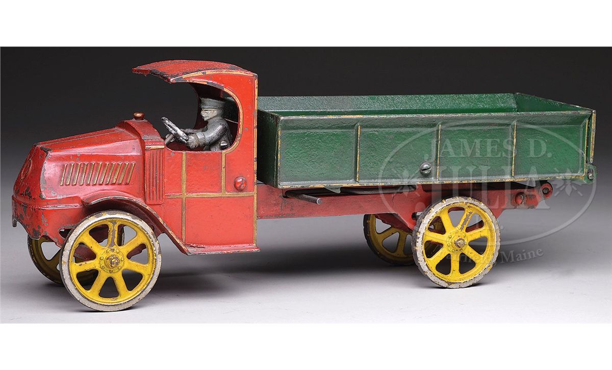 Dent toys were manufactured in Fullerton, PA, which is right next door to Allentown where the Mack Truck factory was located. It was natural for Dent to copy and produce various Mack trucks in miniature form. Dent produced the largest of toy Macks, and this was one of a series of four varieties. This particular vehicle has by means of a lever, a raise-able dump body with an opening tailgate. Truck is enameled in a deep red with a dark green dump body and gilt trims. The spoked iron wheels have yellow centers with simulated rubber tires. Removable figure and steering wheel within cab. SIZE: 15-1/2" l. CONDITION: Overall very good plus. Appears to be an aged repair to frame under dump body. 1-13137