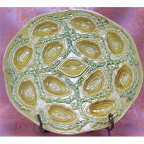 THIS IS A WONDERFUL MAJOLICA OYSTER PLATTER WITH TWELVE HOLES FOR THE OYSTERS. THE COLORS ARE GOLD AND GREEN. THIS WOULD MAKE A NICE PLATTER FOR ENTERTAINING. YOU MAJOLICA COLLECTOR'S CHECK THIS OUT!!!