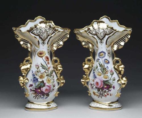 LARGE PAIR OF DECORATED PARIS VASES. Gold trim vases have ivy handles and decorated on the front with rose and colorful flowers. Back with an intertwining gold design. Impressed mark on base “J B P 15”. SIZE: 18” h x 11-1/4” w. CONDITION: One is very good. Other has a crack 5” down the back, otherwise very good. 9-27026