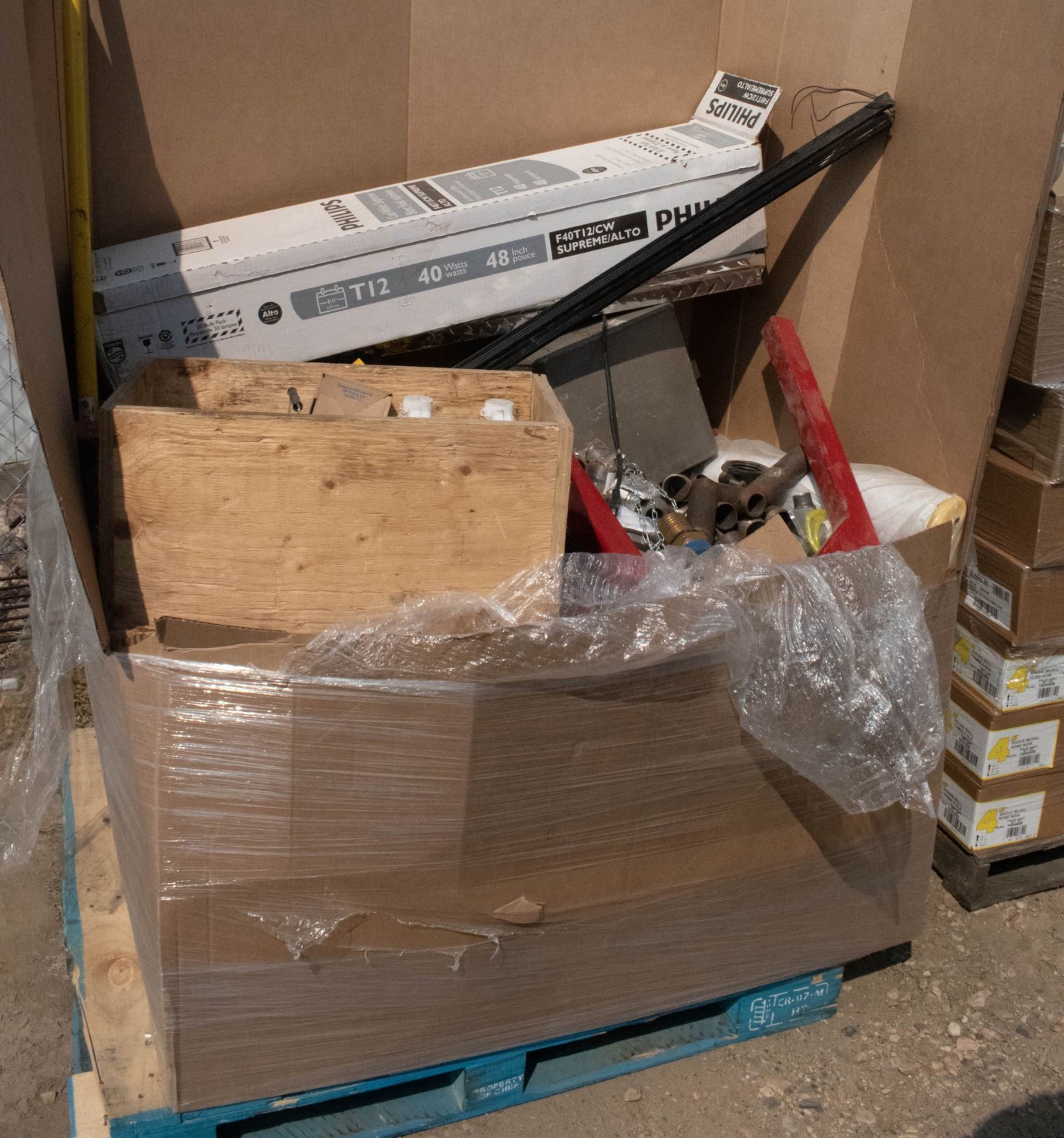 LARGE PALLET WITH LIGHTING, BRASS FITTINGS & MORE.