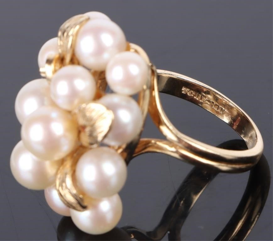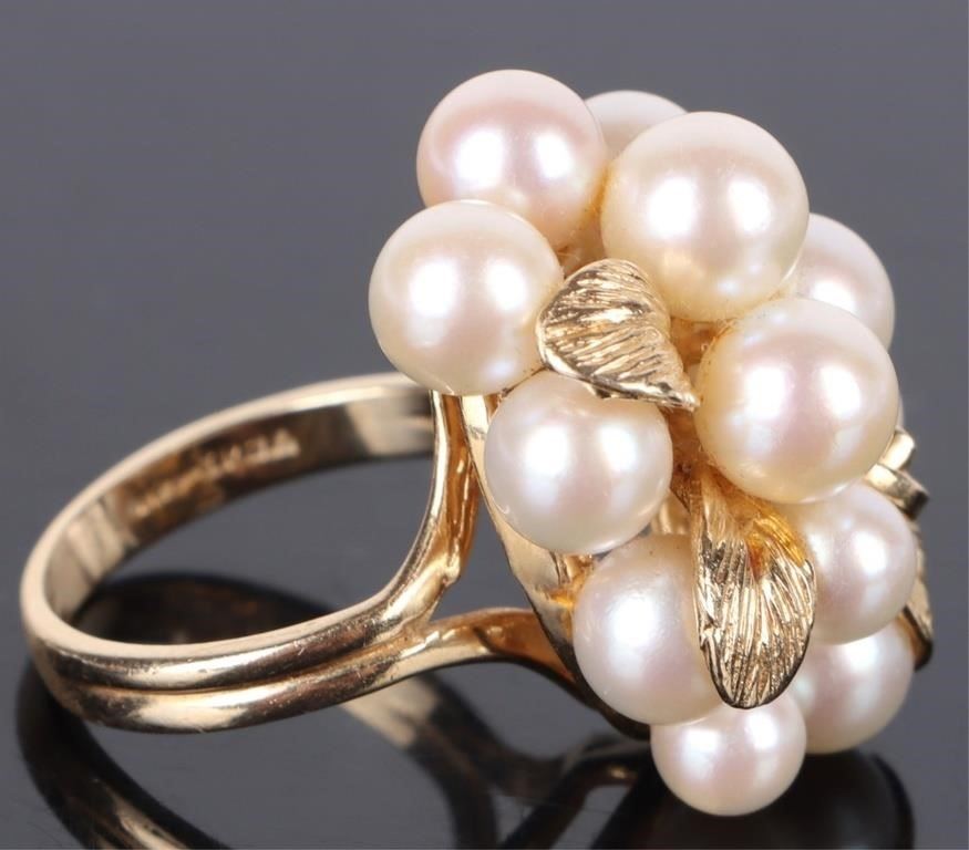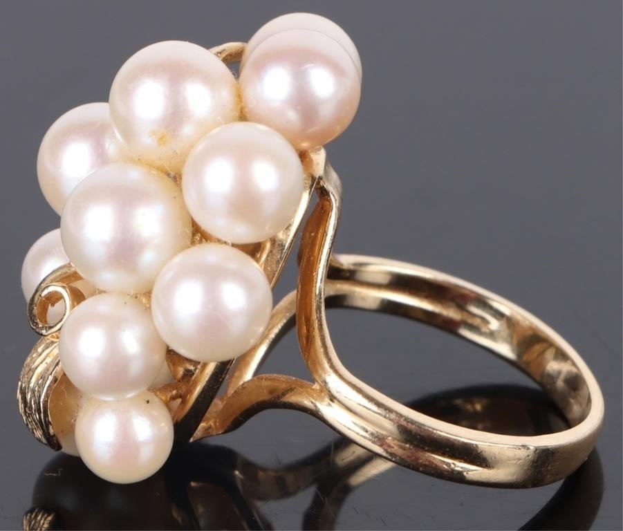 Large pearl cluster 14k yellow gold ladies ring with fourteen 6.1- 4.3mm.