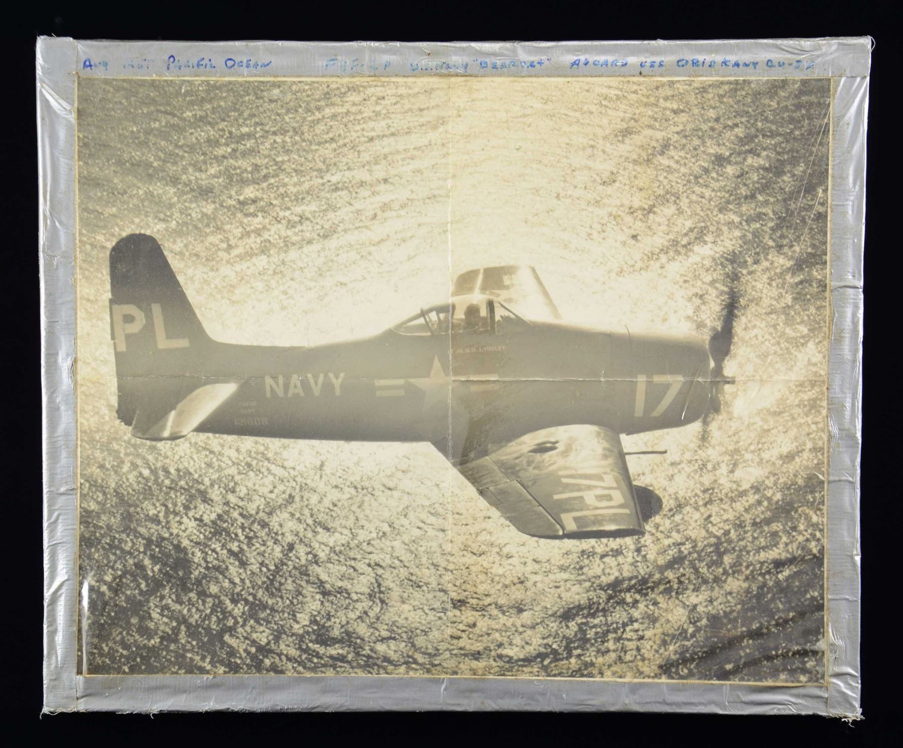 RECONAISSANCE AIRCRAFT. Photo of a U.S. Navy Model F8F-2P Bearcat reconnaissance aircraft (1 of 60 of this variant built). Standard markings on aircraft, with what appears to read "J.G. M.D.J.TURLEY" beside the cockpit. Photo measures 20 3/8" wide and 20 1 1/8" in height. Photo is mounted on a board with duct tape and appears to read "AUG 1951 PACIFIC OCEAN F8F-2P U.S. NAVY "BEARCAT" ABOARD USS ORISKANY CV-34." CONDITION: good, with creasing, a couple of puncture marks, and what appears to be a few minor tears. (02-23185/MLW). NON-GUN. $25-50.