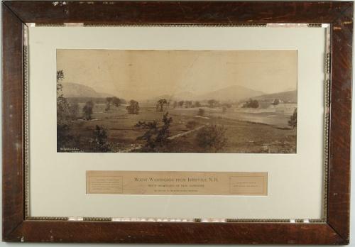 LARGE PHOTO VIEW OF MT. WASHINGTON VALLEY. Photo view depicts Mt. Washington Valley from Intervale, New Hampshire. A panoramic view of New Hampshire mountains and rolling pasture land with village in background. Signed in lower left, "Art Publishing Company, Boston, N.L. Stebbins Photo". And title below, "Maine Central Railroad, White Mountain Park Series #4in.. Framed in a large oak frame with gesso gold liner. SIZE: 47in. w x 32-1/2in. h (including frame and mat). CONDITION: Frame soiled and rubbed. Various imperfections to gesso. Image with overall soiling. 9-26403