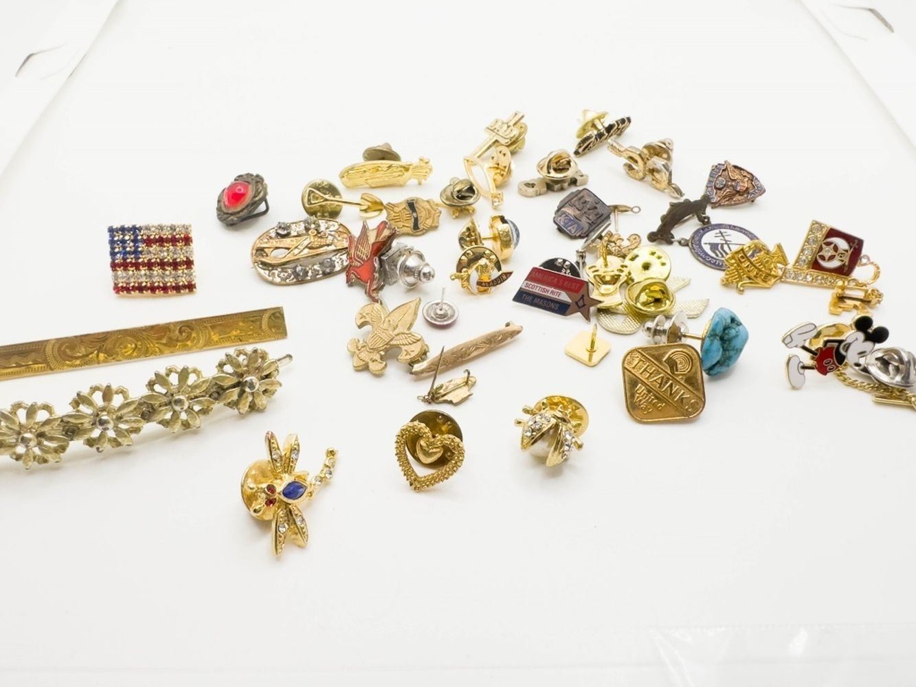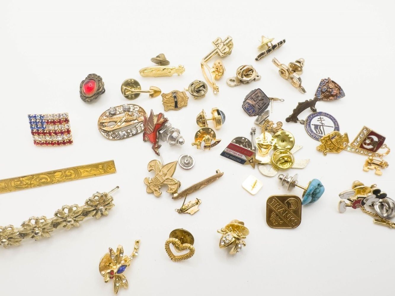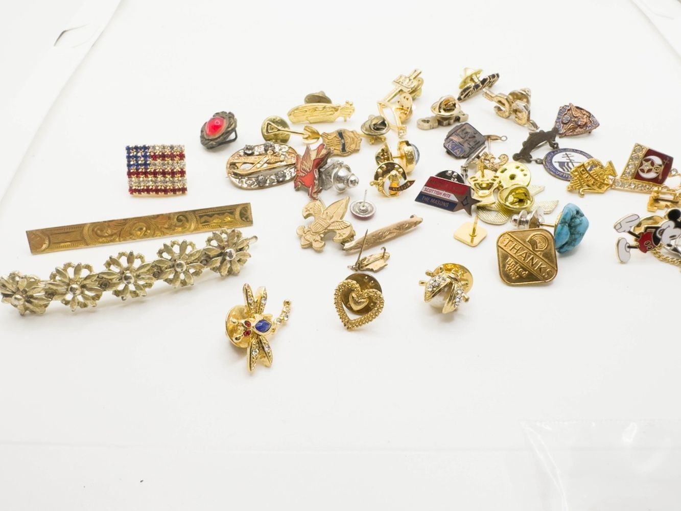 LARGE PIN COLLECTION, 1 C CLASP, GOLD CLUBS, RED STONE, FISH, DAD, FLAG , BOW AND MORE