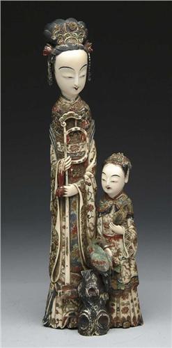 LARGE POLYCHROME DECORATED IVORY FIGURINE. Figurine of mother and child standing next to tree trunk with parrot. Nicely colored with well carved features. SIZE: 16” h x 5” w. CONDITION: Generally good, crack going up trunk. 9-27376