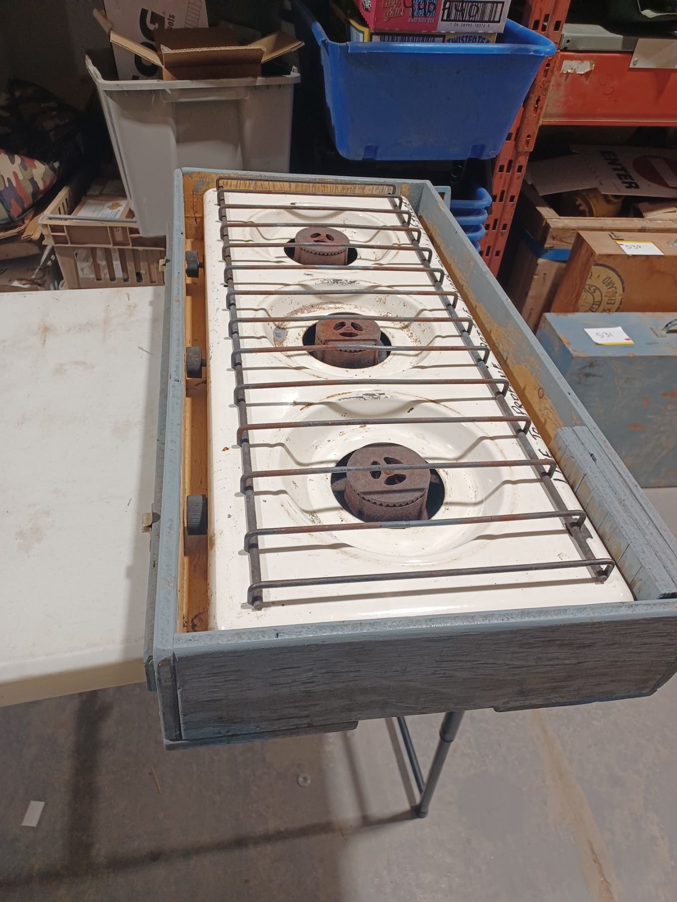 LARGE PROPANE THREE BURNER CAMP STOVE COMES WITH LEGS AND A CARRYING CASE\