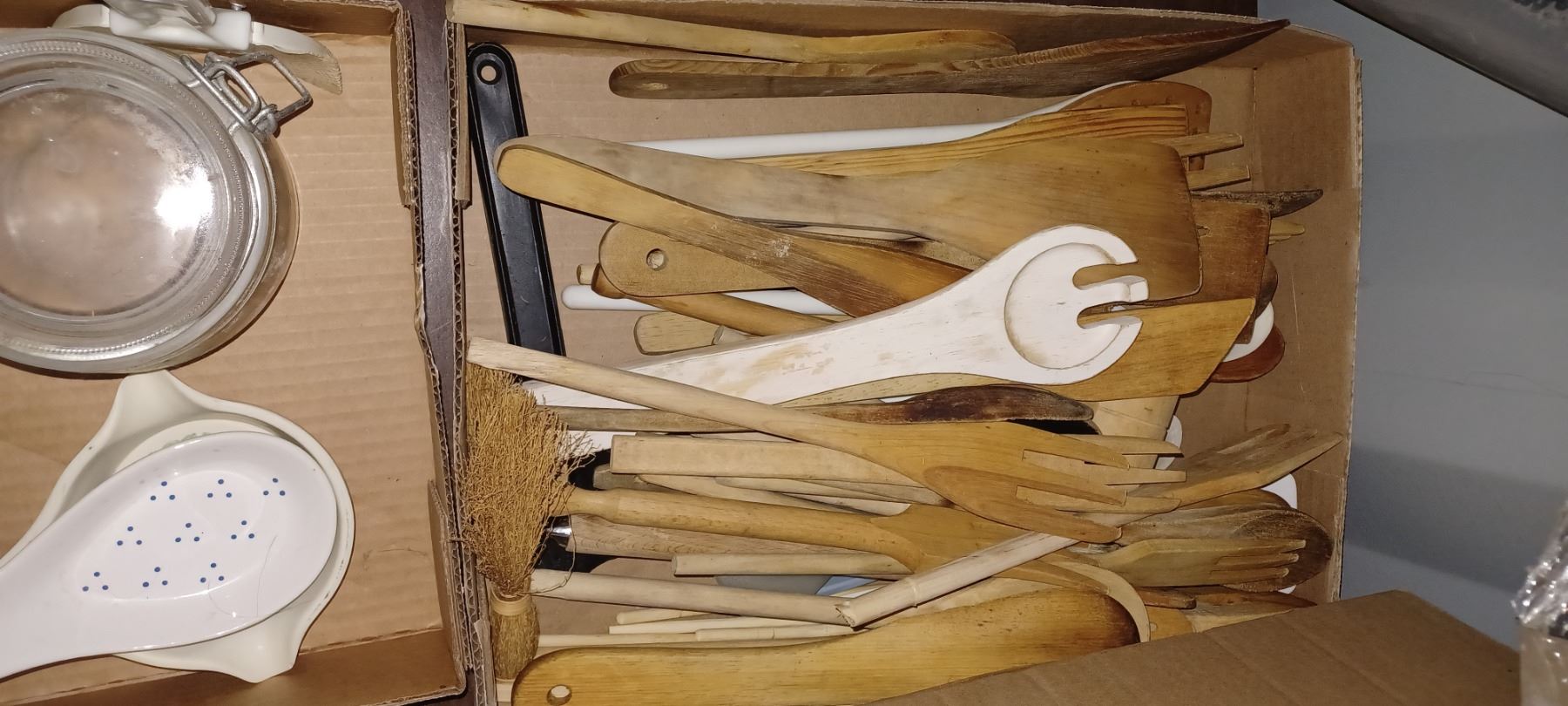 LARGE QTY OF TUPPER WARE AND WOODEN SPOONS . KNIFE BLOCK AND MORE