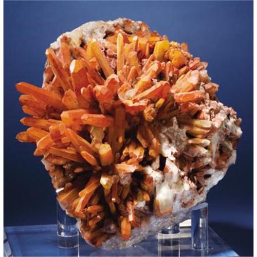 <B>LARGE QUARTZ CRYSTAL GROUP</B></I><BR> <I>Orange River Area, Namibian/South African Border</B></I><BR>The aptly named Orange River is home to this glowing explosion of red and orange prisms. Here, local tribesmen eke out a living in this fierce, sere land. The only water for miles is the river itself, food is something you bring with you and you better not get lost: there are too many places to search. Most specimens from this area feature a showy complement of iron oxide inclusion: the source of the vivid coloration. Since getting into (and out of) the area is no small feat, the selection process for specimens favors the small and easily portable. This large quartz group plays against type by being considerably larger than normal. Radiating crystals up to 2 ¾ inches long stud the upper surface of this flaming pincushion measuring 10 x 9 ½ x 8 inches. There is some minor damage to individual crystals but overall the effect is spectacular. Comes complete with a custom stand. Ex Charles Key Collection.<BR><BR><b>Shipping:</b> Requires 3rd Party Shipping (<a target="_blank" href="http://www.heritageauctions.com/common/shipping.php">view shipping information</a>)
