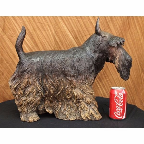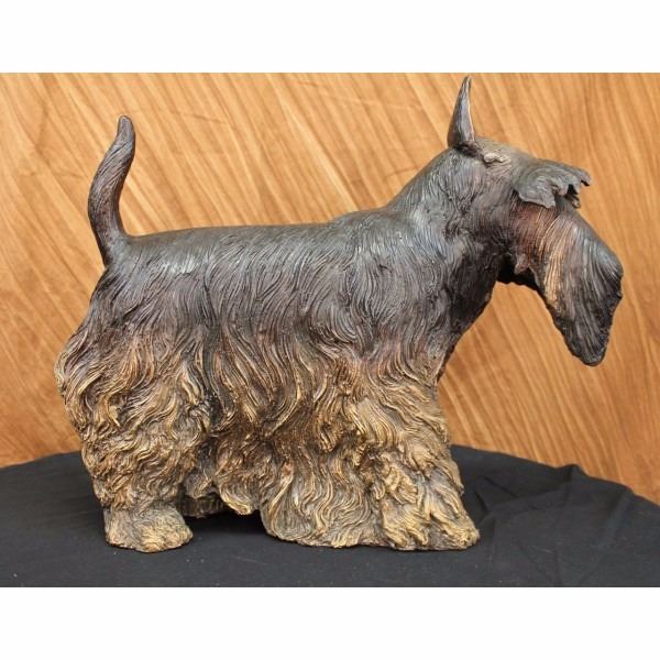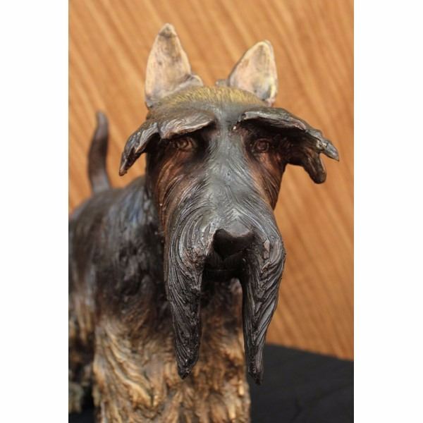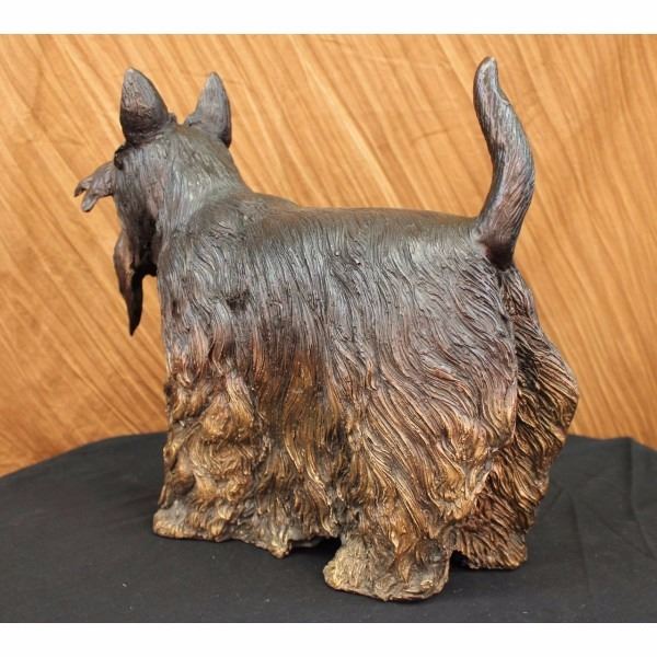 This in an adorably accurate statue of a Scottish terrier. Brave and alert, the Scottie is hardy and lovable. They are charming and full of character. Playful and friendly as a puppy, he matures into a dignified adult. It has a long coat that reaches the floor, each hair is distinguished from the next giving the appearance of a real dogs hair and a nice thick coat. His bushy eyes brows almost cover his eyes, but in the right angle you can see the detail a beauty in them. Two curtains of hair part at his nose, exposing his mouth and snout. The painted detail is what really makes this look like a real dog as it has a two tone patina that blends from dark on his back to light gold at the bottom of his torso, also light on his ears, eyebrows and nose. He is handmade of 100% bronze and cast using the Lost Wax Method and is signed Moigniez. Condition: This sculpture is in perfect condition. Bronze Dimensions :Height 16" x Width 20" Weight : 22 LBS Inventory 93-50416M12239