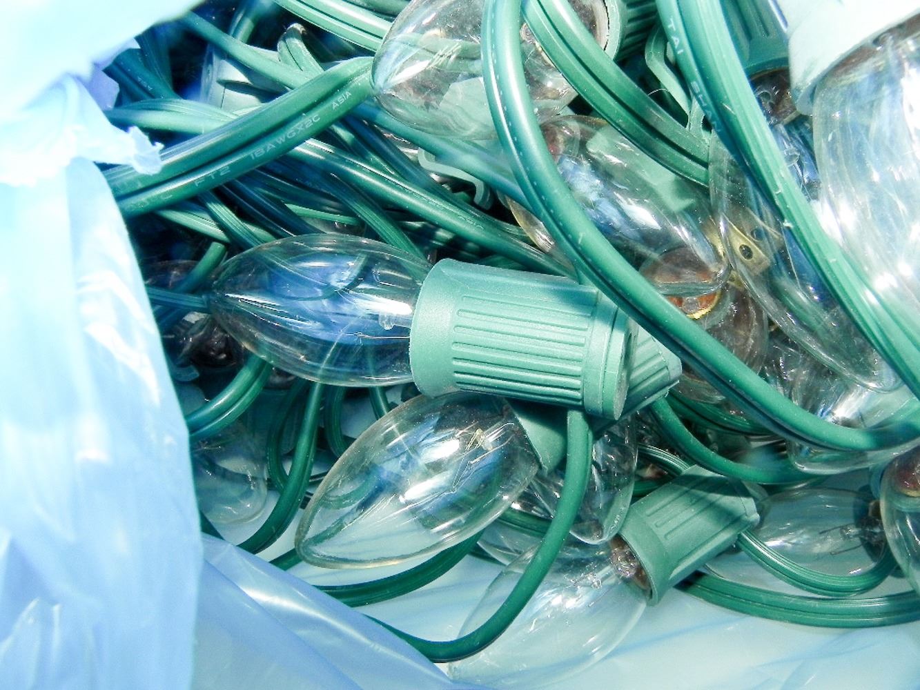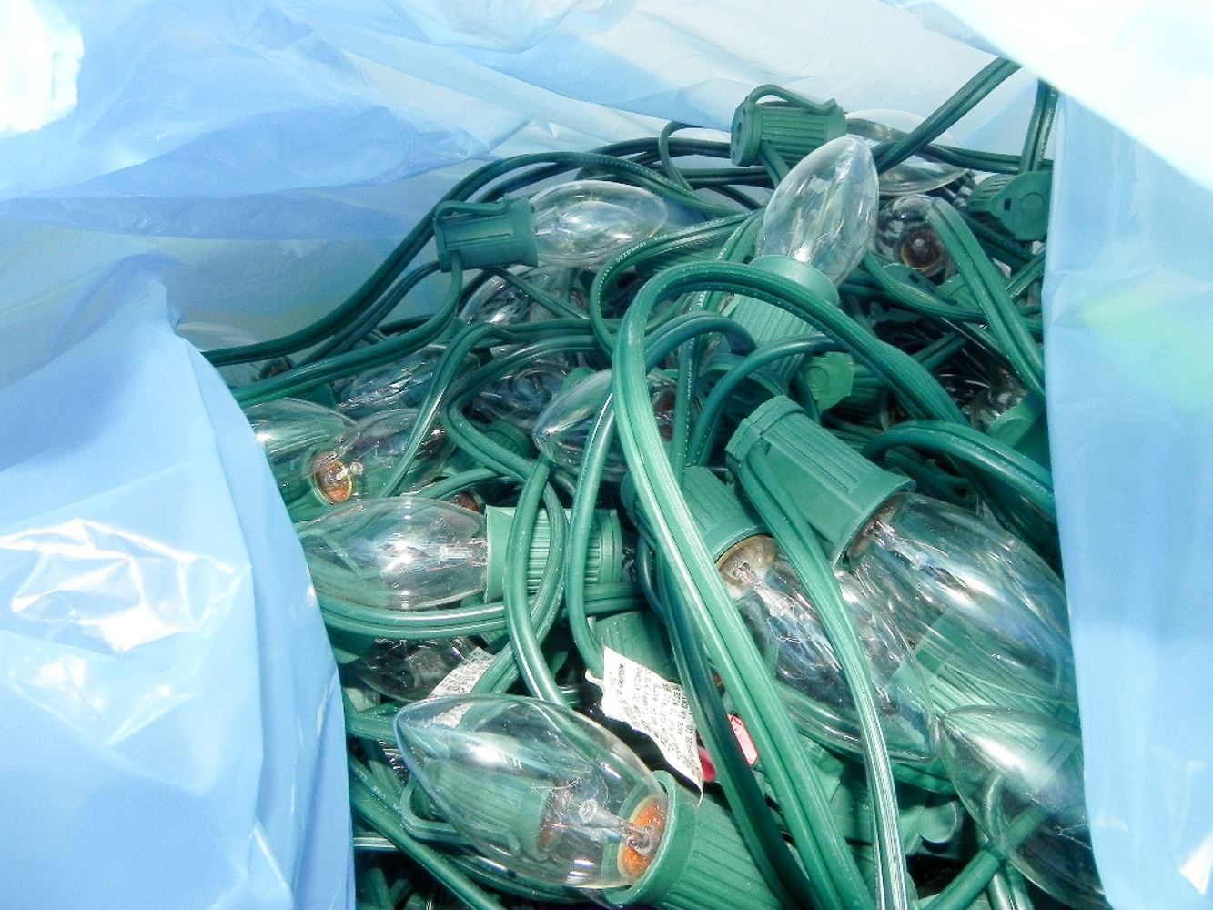 LARGE RECYCLE BAG WITH OUTDOOR LIGHTS. APPROX 5+ STRANDS. TESTED
