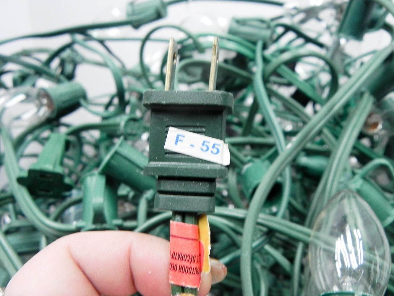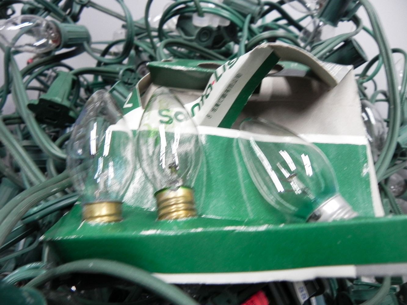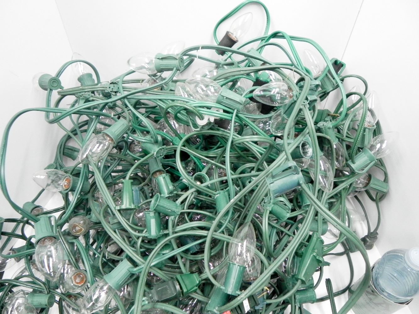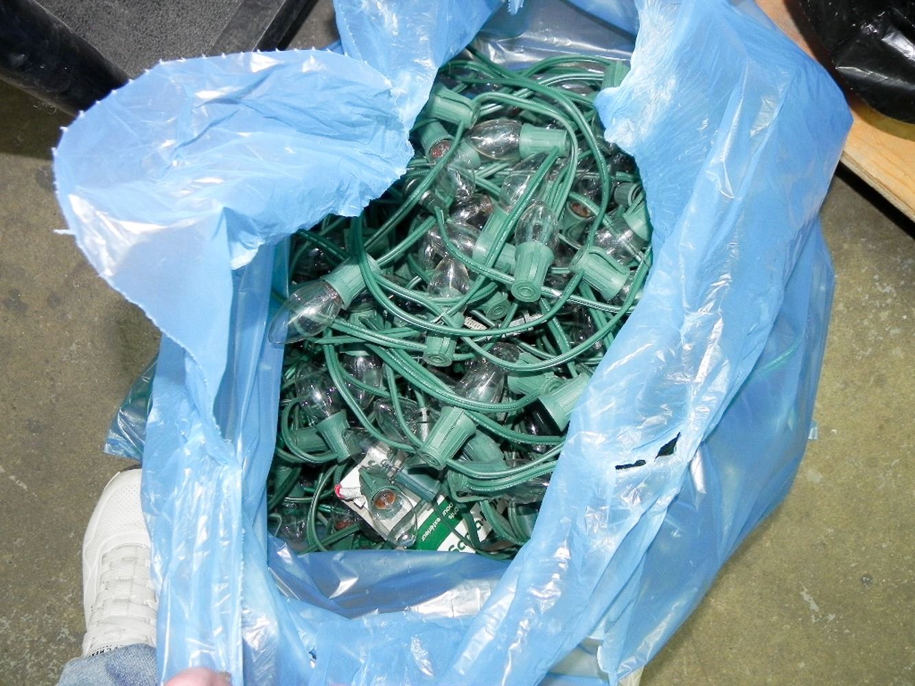 LARGE RECYCLE BAG WITH OUTDOOR LIGHTS. APPROX 5+ STRANDS. WITH SOME SPARE BULBS. TESTED