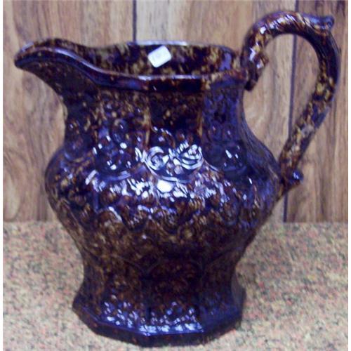 THIS IS A WONDERFUL OLD ROCKINGHAM PITCHER FROM THE 1800'S.IT HAS GOT BERRIES AND VINES. THIS PIECE HAS BEEN AROUND FOREVER AND IS SUCH A GREAT PRIMITIVE PIECE. ON THE HANDLE THEIR IS A PLACE WHERE IT IS WORN ON THE LIP IT IS WORN THE PAINT OFF AND RIGHT UNDER THE LIP. THIER IS ONE OTHER PLACE WHERE A SMALL PIECE HAS BEEN GLUED BACK ON RIGHT ON THE TOP EDGE. IN ALL IT IS STILL A WONDERFUL OLD PRIMITIVE PIECE.YOU ROCKINGHAM COLLECTOR'S CHECK THIS OUT!!!