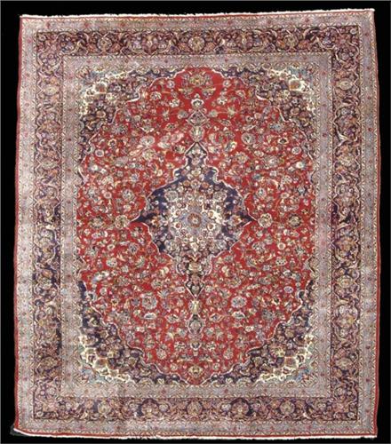 LARGE ROOM SIZE ORIENTAL RUG. Mid 20th Century. Center medallion with all over flower decorated red field. Multiple borders in colors of dark and light blue, red and ivory. SIZE: 13’ x 9’10”. CONDITION: Very good. 9-27843