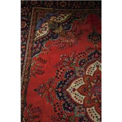Lot # 1266 LARGE ROOM SIZE ORIENTAL TABRIZ RUG. Red field with large shaped center medallion, deep blue border and floral design. SIZE: 13’ x 10’. CONDITION: Some low spots, generally very good. 9-99802 (400-600)