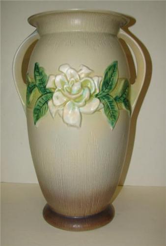LARGE ROSEVILLE POTTERY GARDENIA VASE. Double handles. Marked on bottom “Roseville/U.S.A./690/16”. Shows crazing at base. 16.5” H