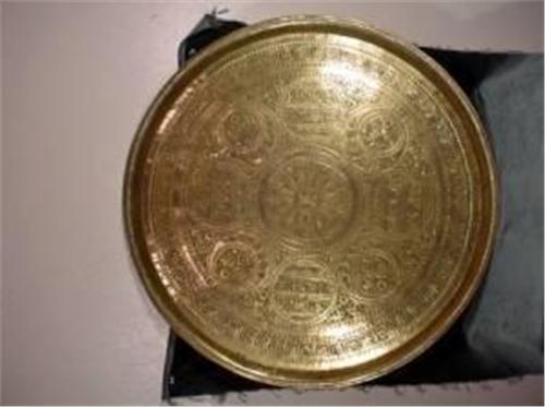 LARGE ROUND EMBOSSED BRASS TRAY WITH AN INDONESIAN STYLE DESIGN IN MOSTLY CIRCLE BORDER PATTERNS. 28