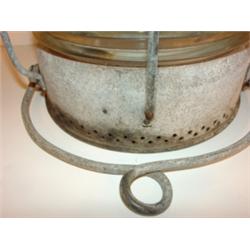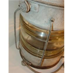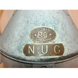 LARGE SHIP'S LANTERN. Clear glass globe. Marked with label "Eli Griffiths & Sons-Birmingham-3I" and "N.U.C." Metal frame shows signs of age and wear. 24" H