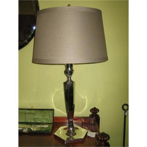 A STUNNING TALL ENGLISH SILVER PLATED TABLE LAMP ON HEXAGONAL BASE WITH A TAUPE LINEN REPLACEMENT SHADE. THE LAMP HAS BEEN REWIRED FOR SAFETY AND THE EUROPEAN FITTINGS REPLACED WITH A US FITTING AND PLUG. THE LAMP HAS A BEADED DECORATION TO THE TOP OF THE LAMP. IT MEASURES 29.5 INCHES TO THE TOP OF THE SHADE WITH AN ADDITIONAL 2 INCH SILVER PLATED ACORN FINIAL.