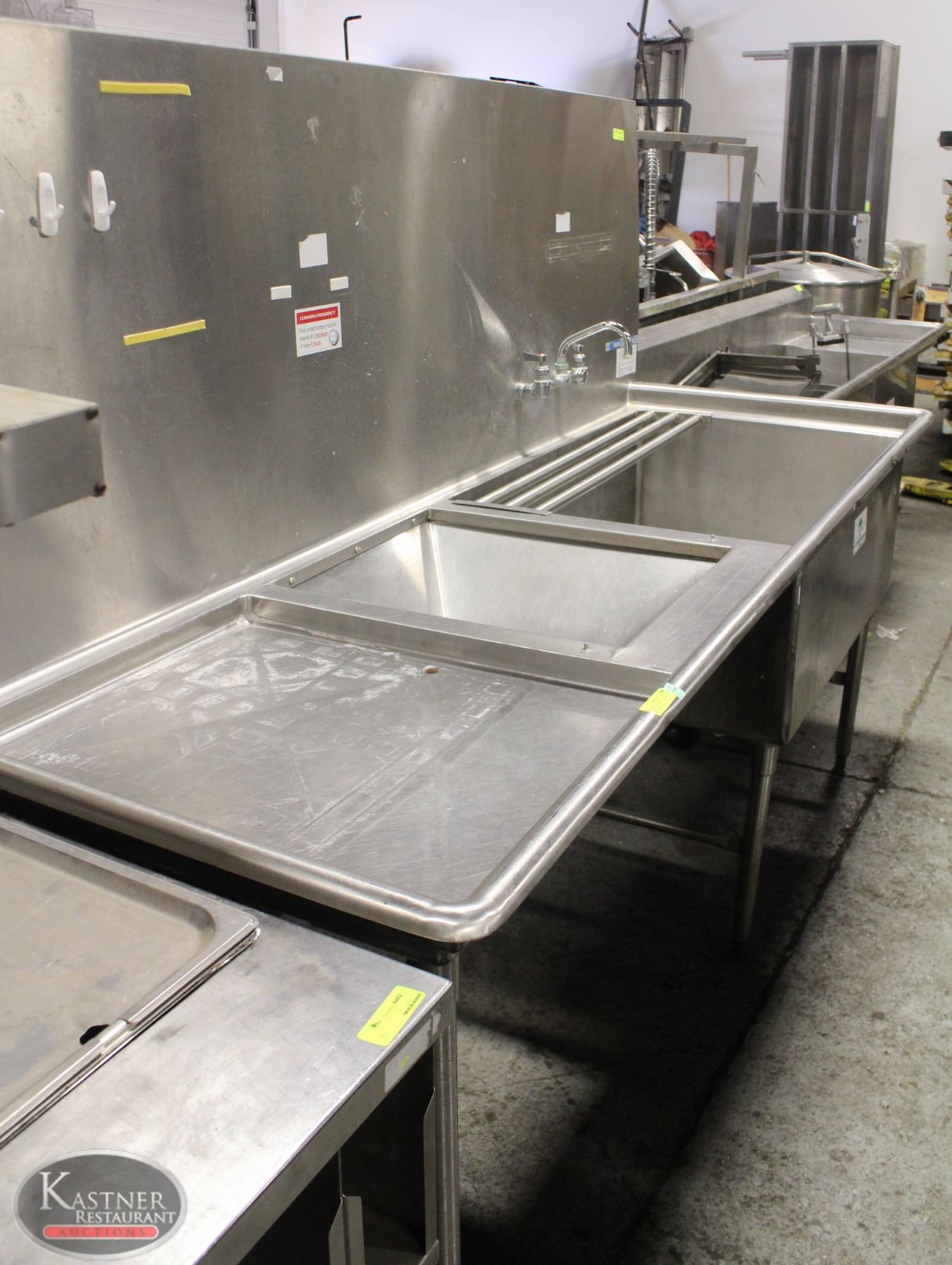 LARGE SINGLE WELL SINK WITH DRAIN BOARD AND GARBAGE SHOOT. 95"X34"X67" /W 32" BACKSPLASH