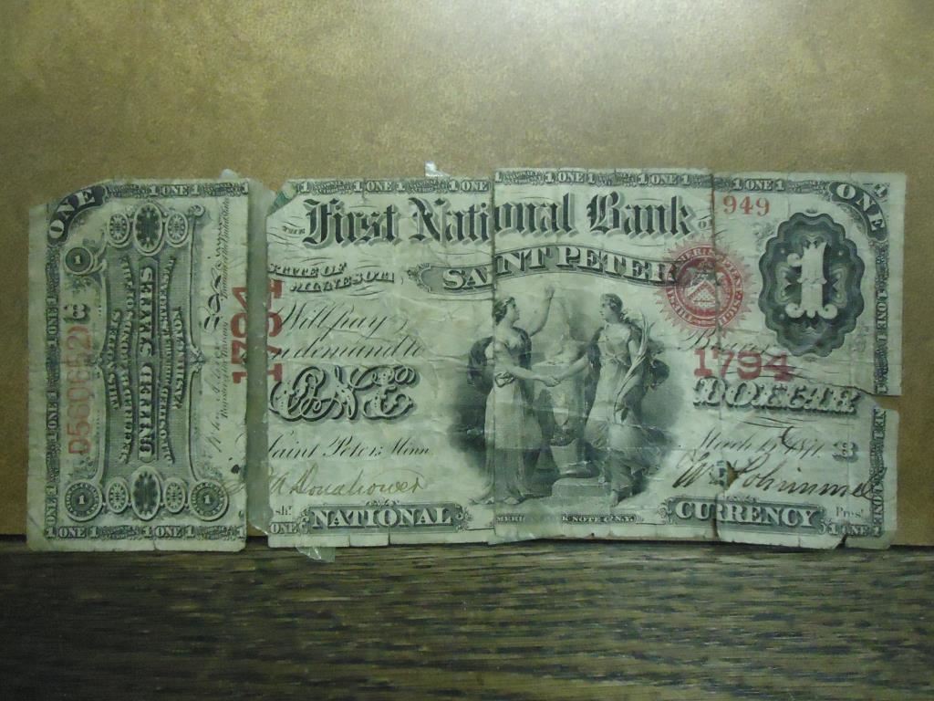 TYPE ORIG. DENOMINATION $1, SIGNATURE'S ARE ALLISON-SPINNER. TORN, RETAIL IN VERY GOOD IS $800.00, ST. PETERS MINNESOTA