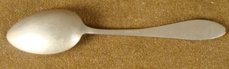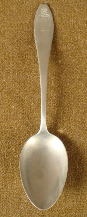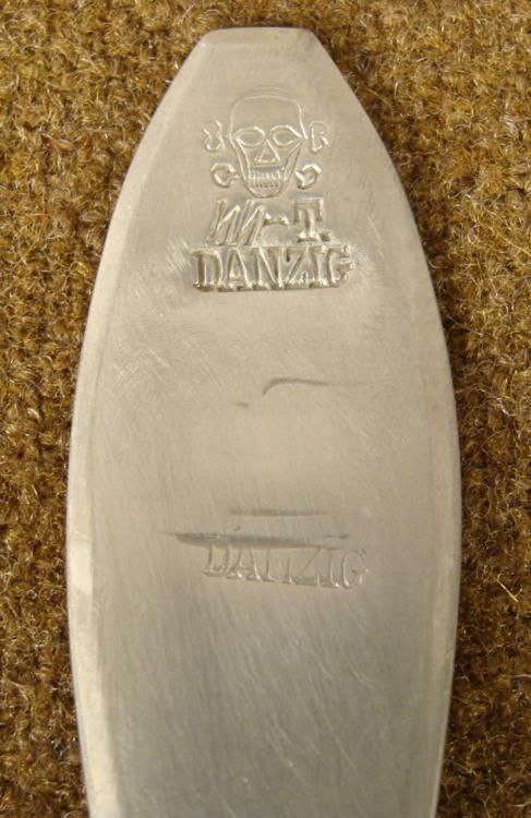 OFFERED HERE IS A LARGE SS DANZIG MESS HALL SOUP SPOON. IT IS MARKED DANZIG WITH A SKULL, CROSSBONES, AND SS-T. ABOVE IT. BELOW THE MAKERS MARK IS WORD DANZIG, AGAIN, STAMPED INTO THE HANDLE. ON THE REVERSE IT IS MARKED "ALPACCA-BA.H." THE SPOON IS 8 1/4" LONG AND IS IN EXCELLENT CONDITION. * * * *