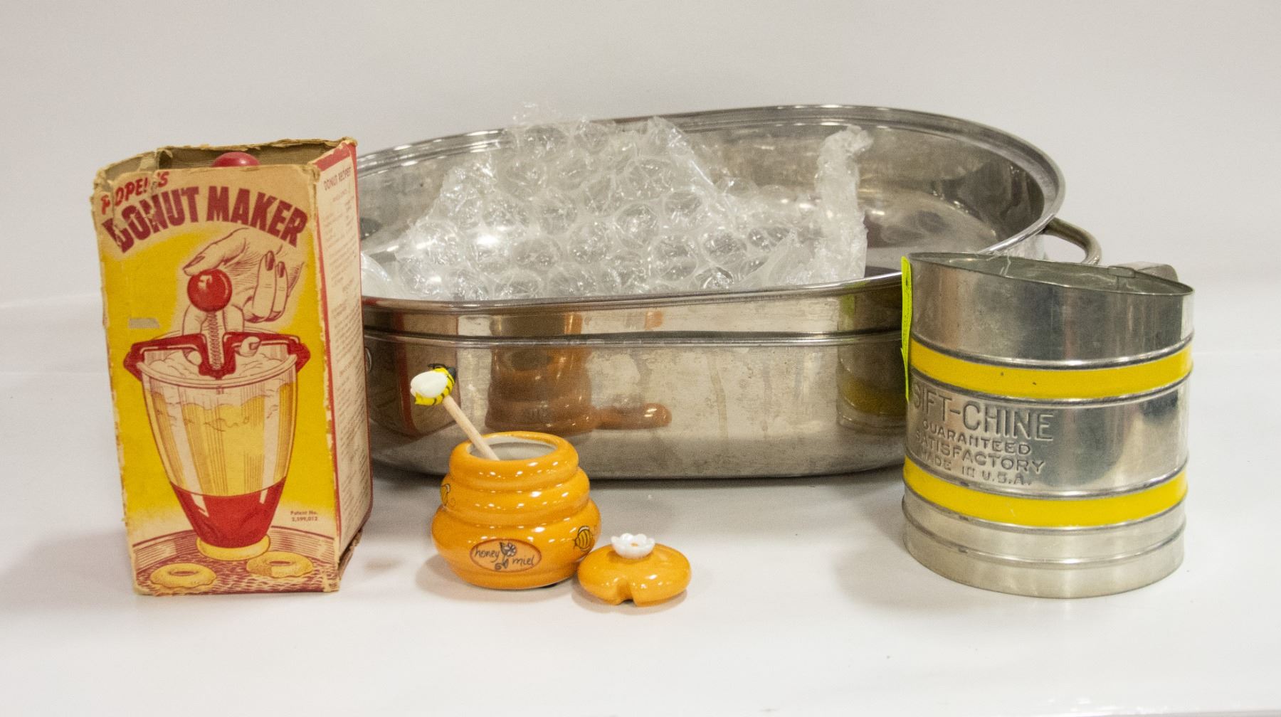 LARGE STAINLESS ROASTER, DONUT MAKER, SIFTER,