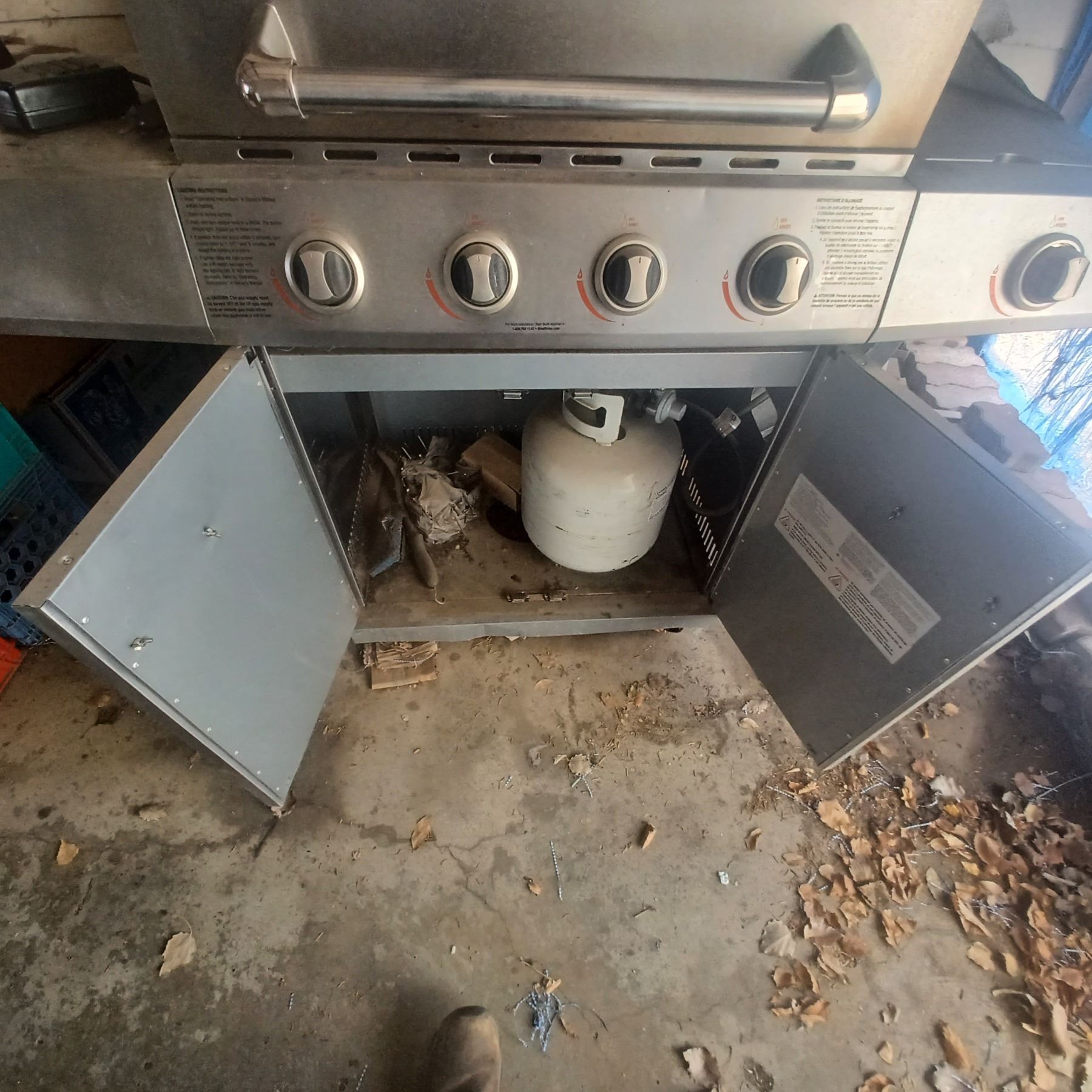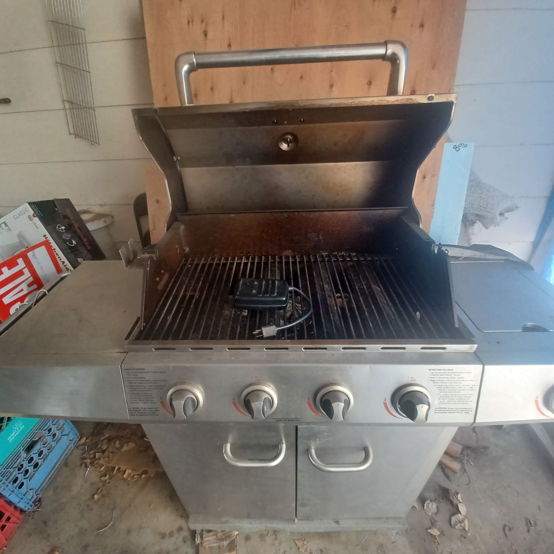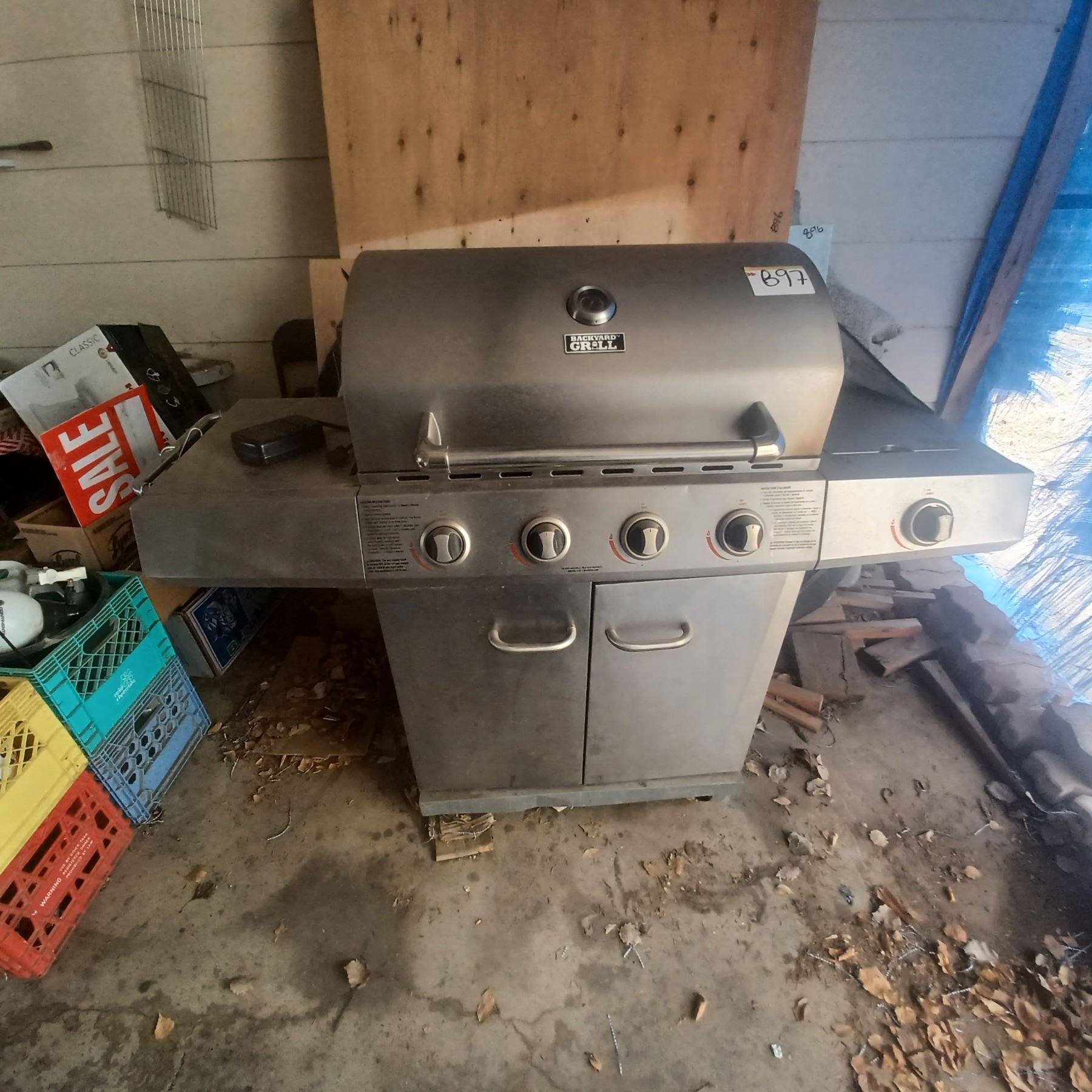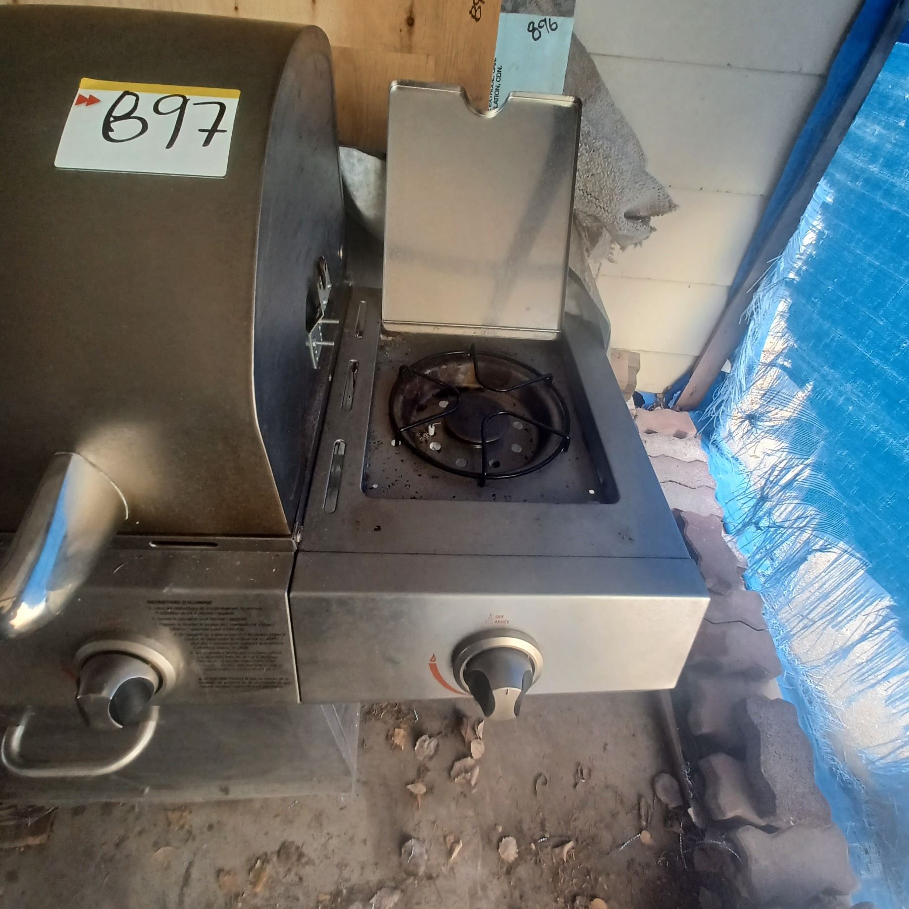 LARGE STAINLESS STEEL BACKYARD GRILL C/W SIDE BURNER, 2 PROPANE BOTTLES AND COVER