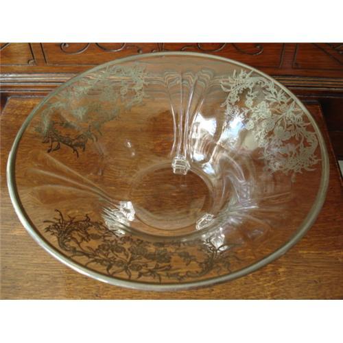 Beautiful vintage glass large footed bowl with lovely sterling silver overlay. The bowl is a beautiful example of silver overlay, a beautiful intricate pattern. The sterling is in great condition, intact. It measures 11 inches across and standing about 4.5 inches high, in fabulous condition-no chips or cracks. A most elegant example of silver overlay glass to add to your collection of antique -vintage glass. Please do view our other pieces we have just listed.